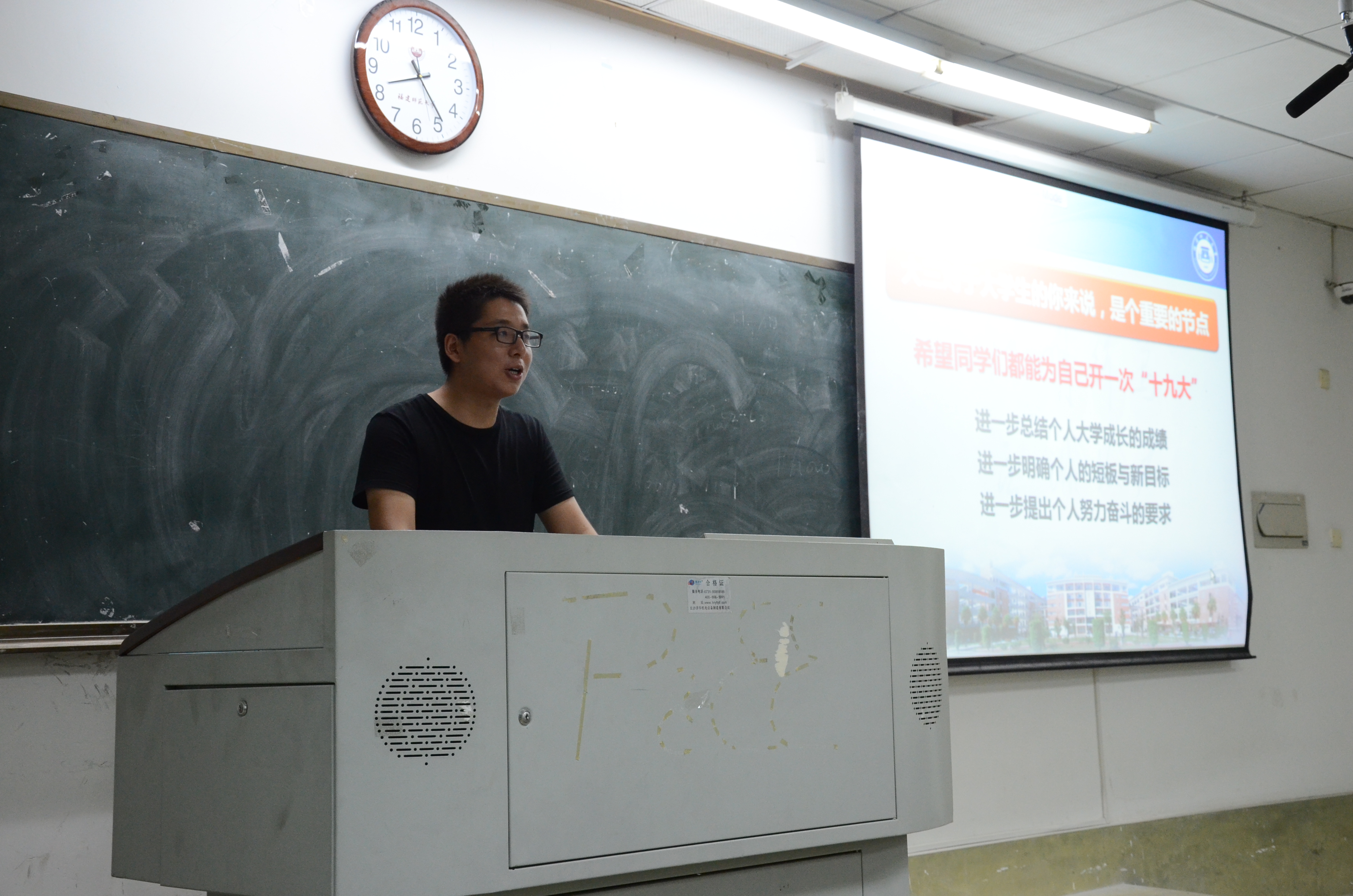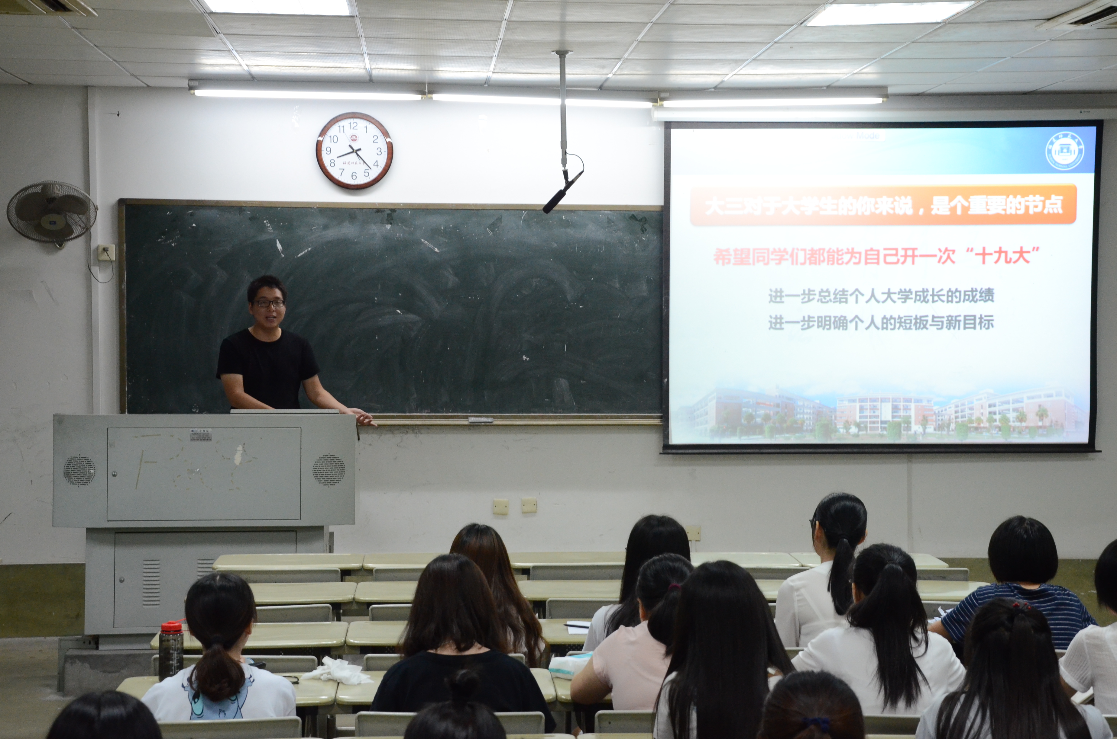 9月10日晚20:00,辅导员金程远老师为大家上了一堂精彩的开学第一课。本次授课名为“由喜迎十九大联想到我们的大三”,我院15级全体同学参加了此次活动。