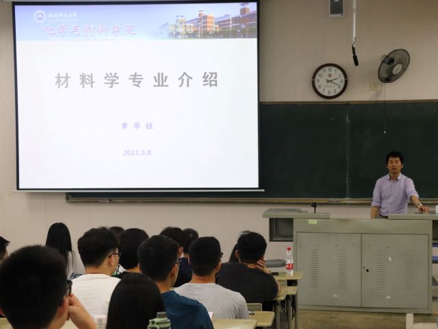 2021年5月8日下午,福建师范大学化学与材料学院2020级于知明楼1-104教室举行了材料类专业分选大会。此次会议由2020级辅导员杨忠老师主持,化学与材料学院副院长刘海清教授、材料系主任章华桂教授、材料系副主任简荣坤教授、17级复合材料专业钟佳华和16级复合材料专业黄鸿键出席了会议并与同学们进行了关于专业问题的交流。