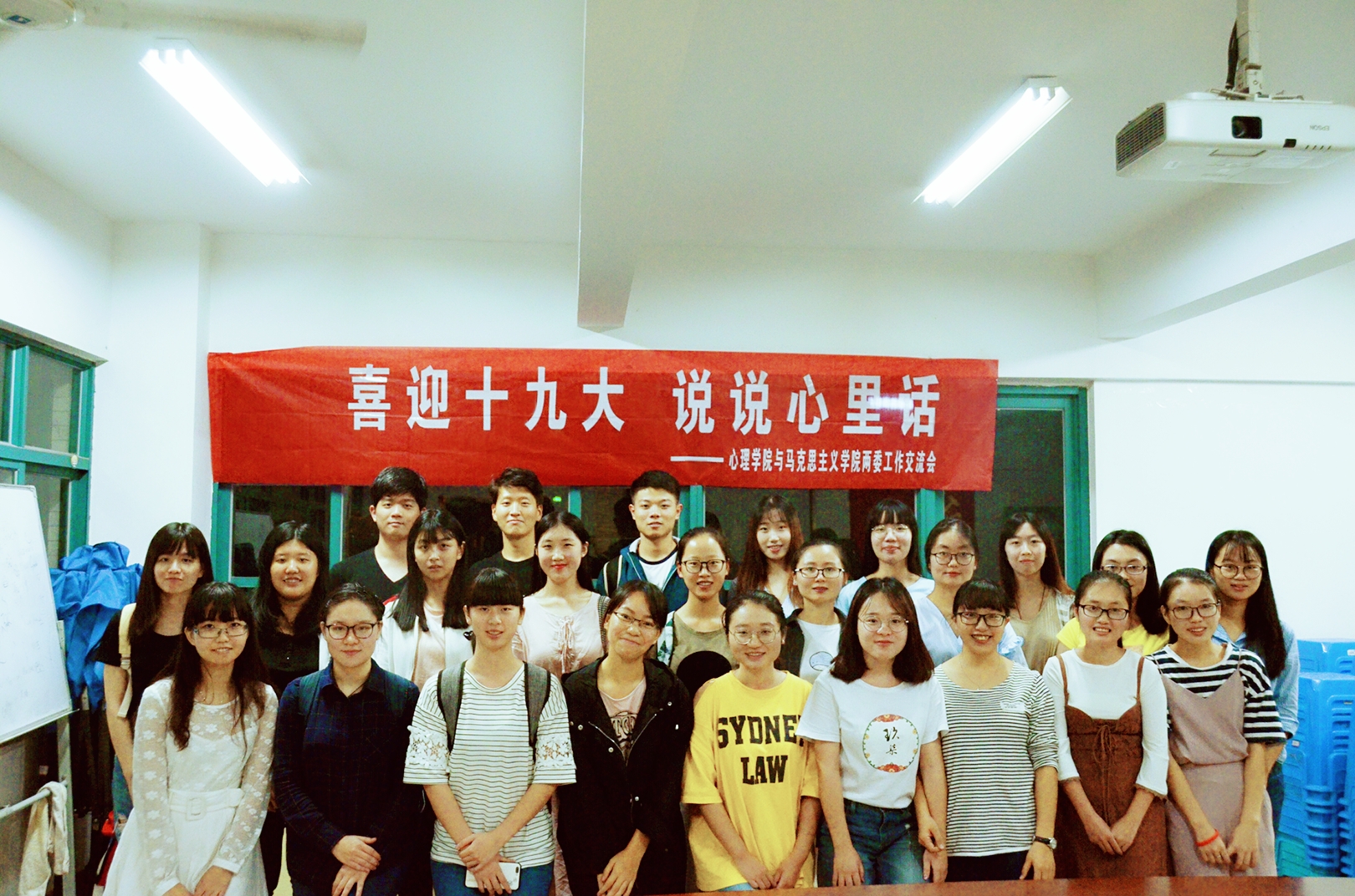 为回顾历史、总结经验、展望未来,10月20日下午17:00,我院联合心理学院于桃12女一党团活动室举办“喜迎十九大,说说心里话”主题工作交流会。两院团委学生会成员参与了本次活动。