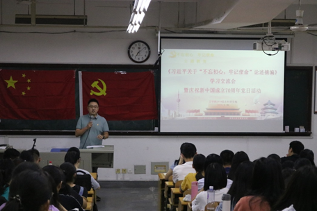 同时,党支部以“成长在新时代”为主题开展党日活动,以庆祝新中国成立70周年。本次党日活动首先组织大家观看《我们走在大路上》纪录片第一集《新中国诞生》,缅怀那段让人热血澎湃的时光,向英雄致敬。紧接着,是“成长在新时代”党日活动的交流环节,党支部成员结合自身社会实践情况,分为暑期社会实践、支教团、志愿者和新发展积极分子五个队伍,他们一一上台分享自己在新时代学习成长的体会和感悟。