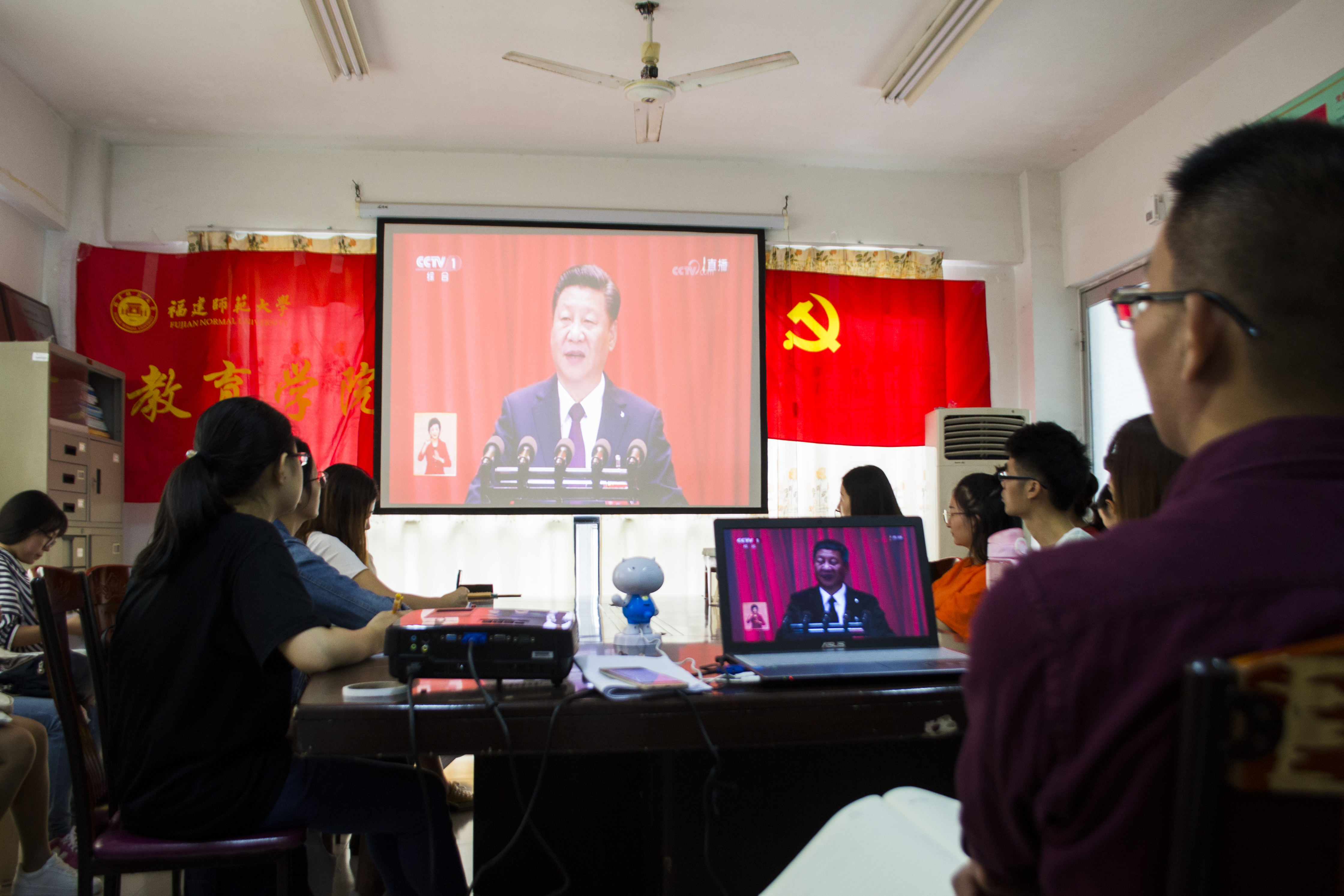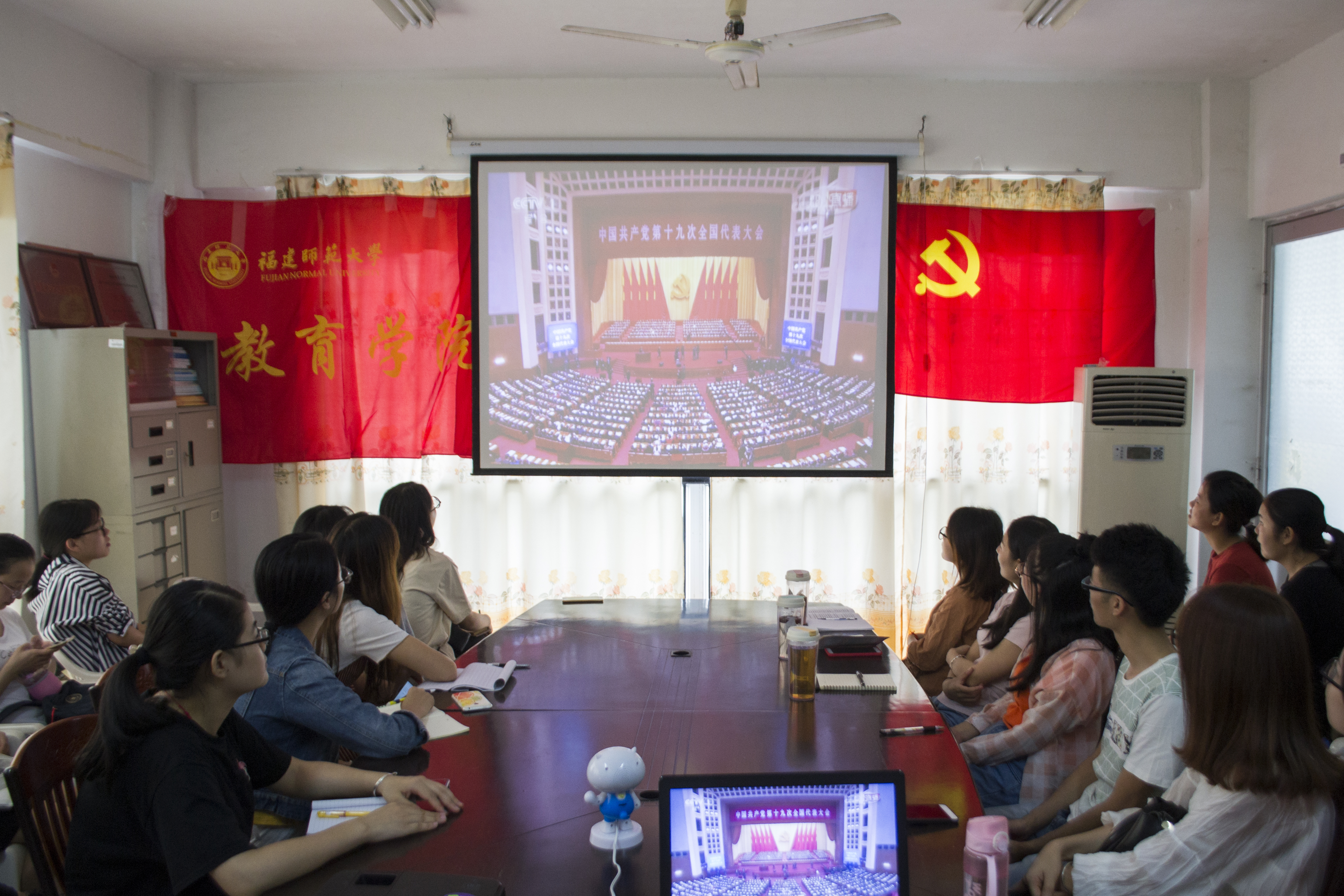 2017年10月18日上午9点整,中国共产党第十九次全国代表大会开幕会在人民大会堂举行,习近平总书记代表第十八届中央委员会向大会作了题为《决胜全面建成小康社会 夺取新时代中国特色社会主义伟大胜利》的报告。与此同时,福建师范大学教育学院的党团活动室里座无虚席。院团委书记杜成煜和各年级辅导员带领着院两委干部、党员和积极分子观看中共十九大的开幕式直播,学习习近平总书记在十九大上的重要讲话。