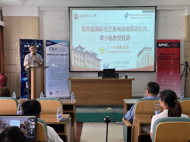第四届“国际光日”系列活动开幕仪式于5月16日上午在理工楼3-102隆重举行。光电与信息工程学院院长李晖教授、信息光子学研究中心主任谭小地教授、OEA执行主编洪明辉院士、西安电子科技大学刘金鹏副教授、东京大学吴安安博士、中科院上海光学精密机械研究所王飞博士、信息光子学研究中心全体师生及学院学生代表100余人参加了活动。李晖院长、谭小地教授分别致辞。李晖院长指出,人类每次对光的本性有新的认识,人类社会文明便能得到巨大的发展。谭小地教授则向同学们介绍了国际光年和国际光日的由来。