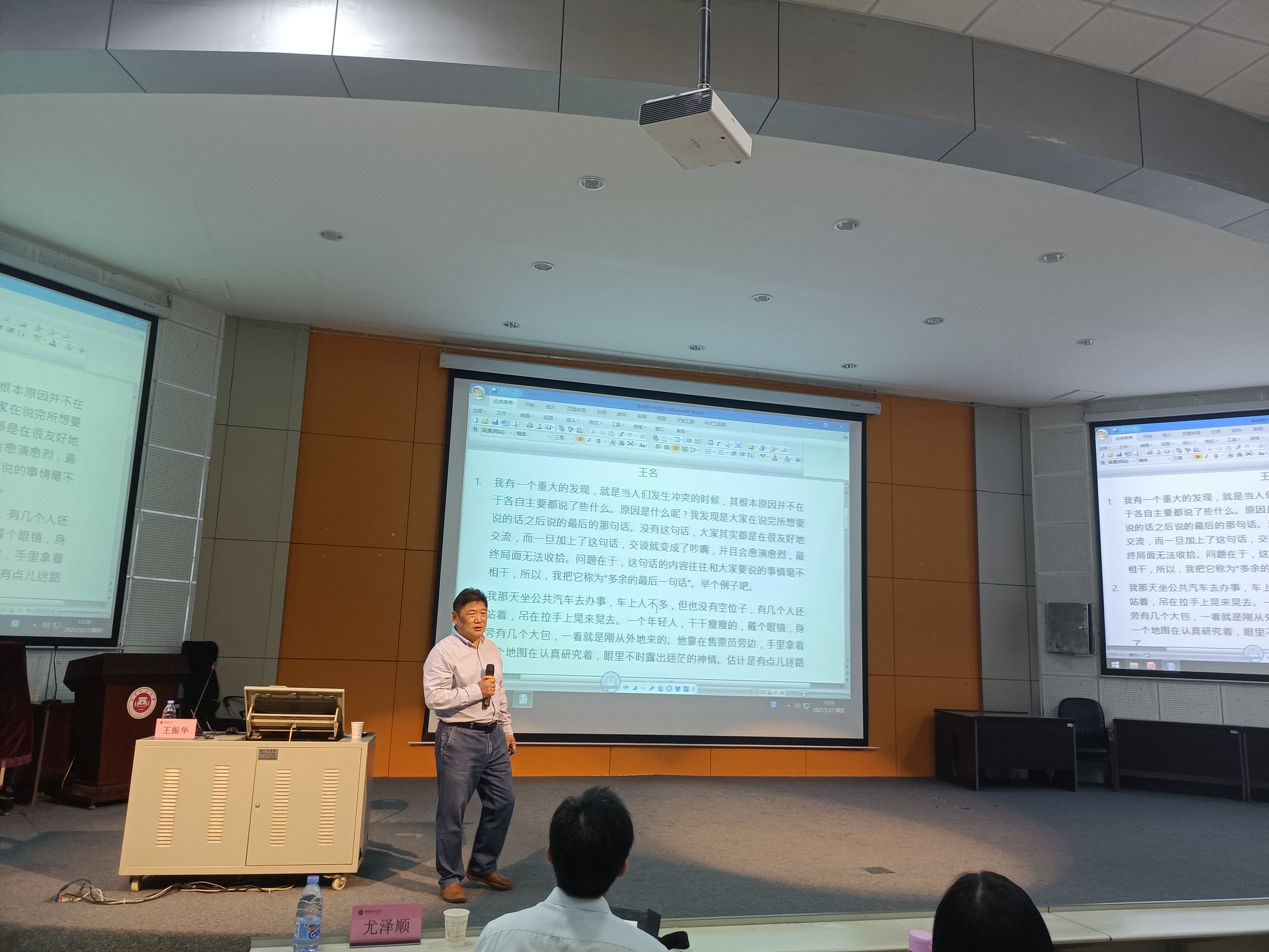 2021年5月27日下午,上海交通大学外国语学院博士生导师,马丁适用语言学研究中心主任,国务院特殊津贴专家王振华教授,应邀做客外国语学院多功能厅,为外国语学院学子开展题为“大语篇的陈述句”的讲座。王振华教授主要研究系统功能语言学和法律语言学,已发表论文近百篇,出版著作、编著、译著和教材23部。讲座由外国语学院欧语部主任尤泽顺教授主持,本科生和研究生约300人参与。