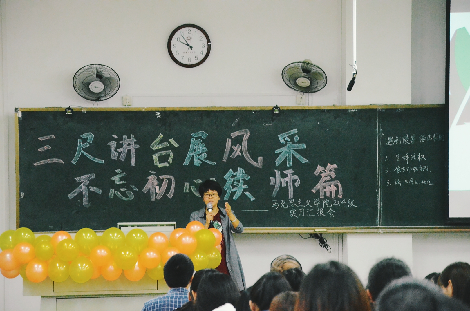 本次活动为2014级同学提供了一个总结整理、分享经验的机会,不仅展示出2014级同学们初为人师的风范,也拉近了2015级同学与中小学政治学科实践的距离。