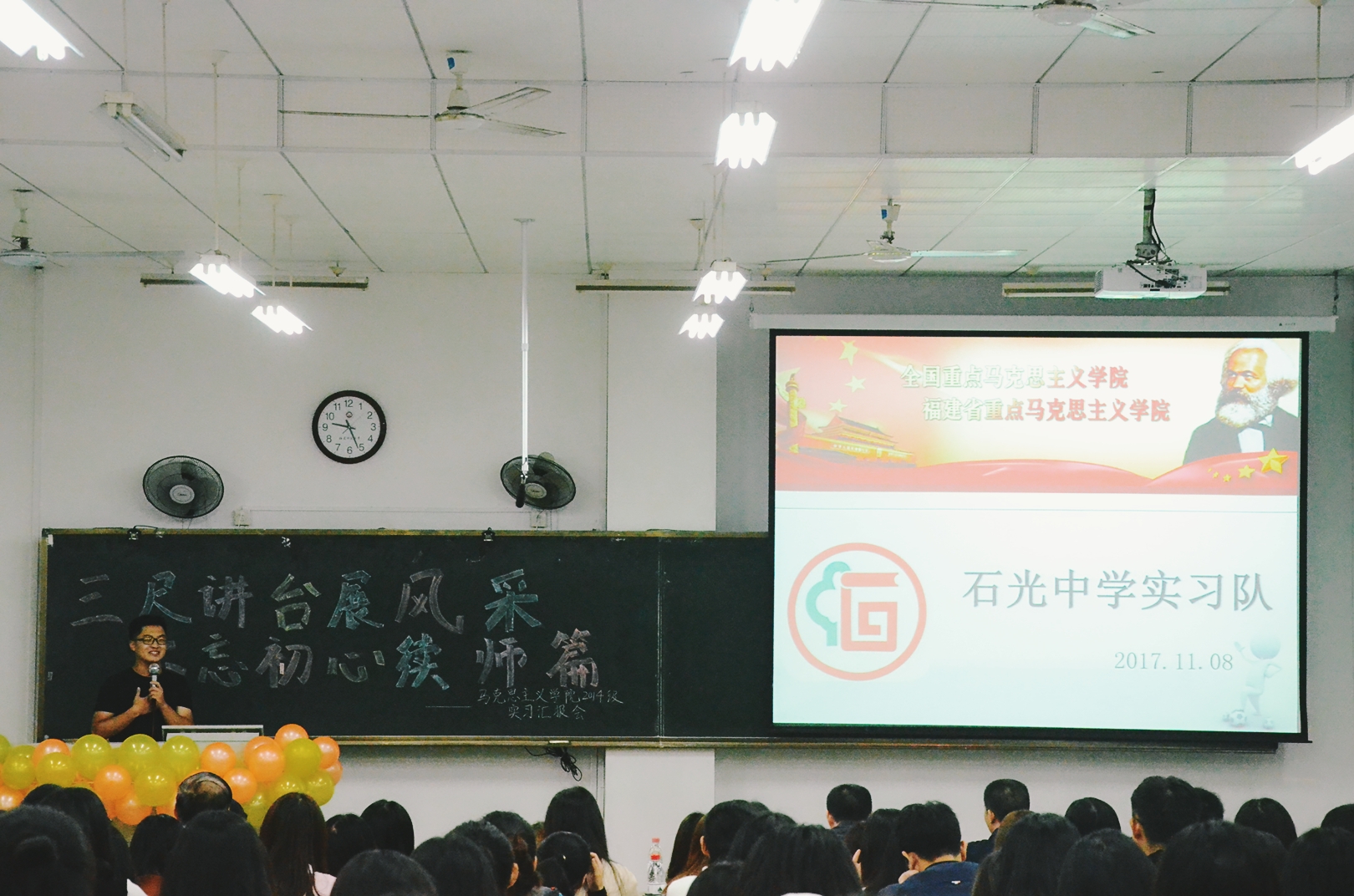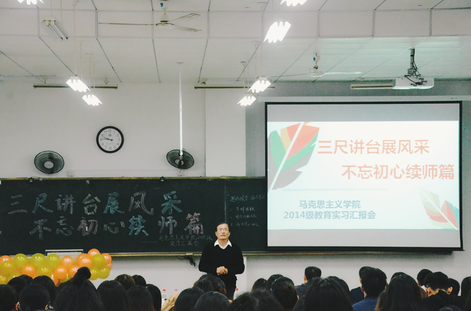 11月8日上午8:00,马克思主义学院2014级实习汇报会于立诚1-105举行。莅临本次活动的有院党委书记陈永森老师、党委副书记陈秋华老师、副院长杨林香老师、思政系主任廖志诚老师、思政系宋鲁闽老师、刘国皇老师、蔡华杰老师以及辅导员苏剑老师、金程远老师,2014、2015级全体同学参加了本次汇报会。