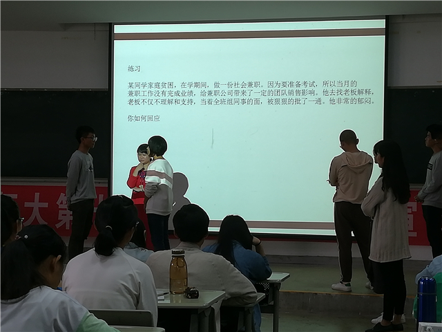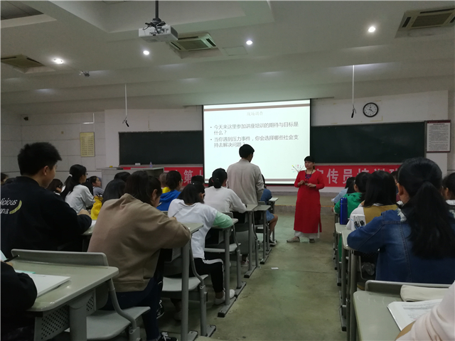 活动伊始,徐艺端老师问了大家两个问题:参加本次讲座的期待是什么?当遇到压力事件,你会选择哪些社会支持去解决问题?这两个问题引起了同学们的思考,一位同学说希望通过本次讲座学会倾听,另一位同学则表示想要成为一名专业的心理咨询师。听了同学们的发言,徐艺端老师讲了一句话:“咨询不是教育,倾听是一门技术。”顿时,现场响起雷鸣般的掌声。接着,徐艺端老师为同学们讲解了朋辈辅导的基本要领,教大家如何营造一个好的咨询环境。最后,徐艺端老师向同学们介绍了处理情绪的技巧与方法,并邀请同学们根据设定的场景上台进行即兴演练。