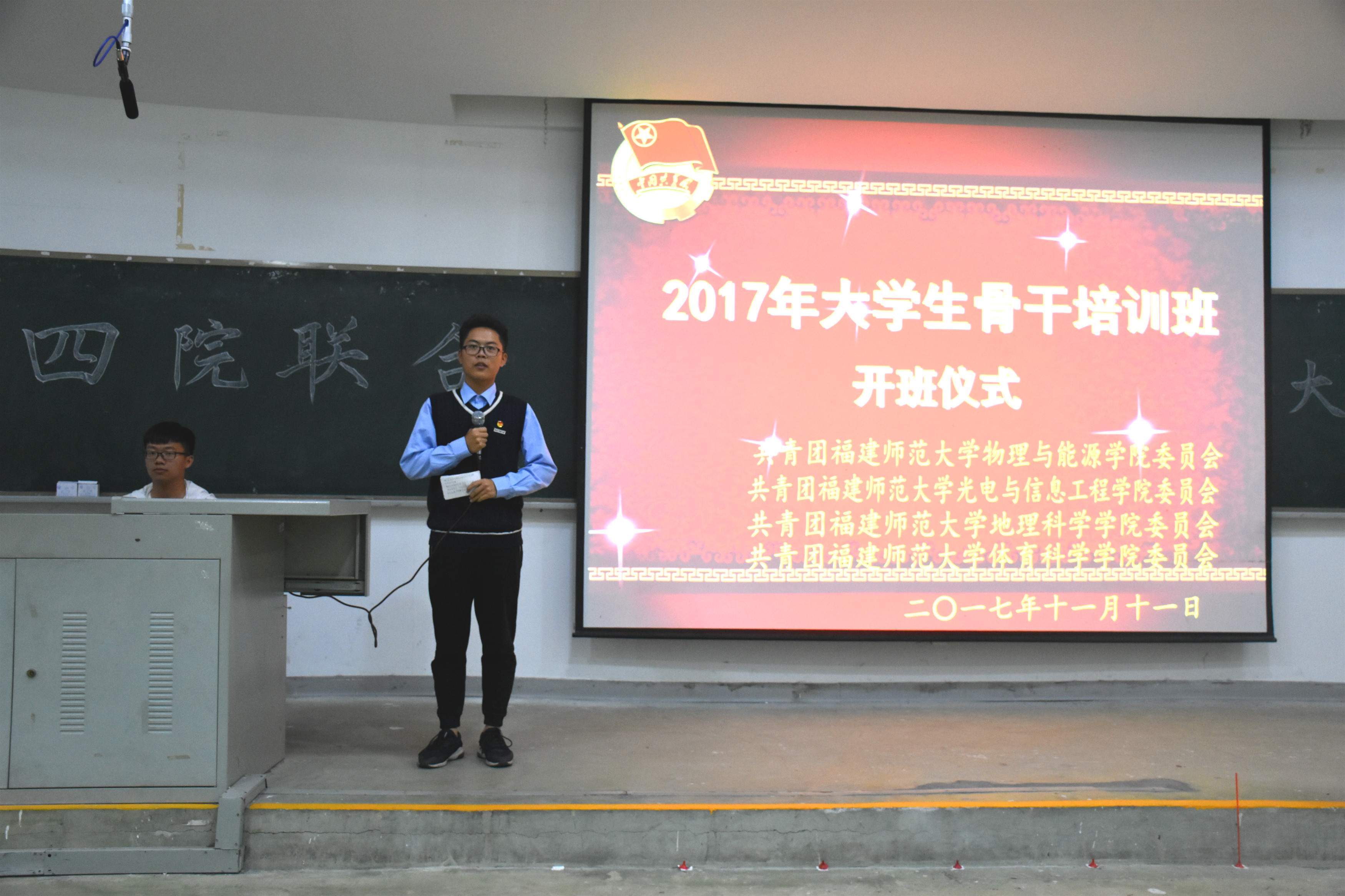 11月11日晚上6时30分,由物理与能源学院牵头主办,体育科学学院、光电与信息工程学院、地理科学学院联合举办的2017-2018学年大学生骨干培养班在知名2-201开课。此次活动共有二百余名学生干部参加,并邀请到了福建师范大学物理与能源学院党委副书记钟庆林、光电与信息工程学院党委副书记辛承南、地理科学学院党委副书记邱海锋等参与指导。