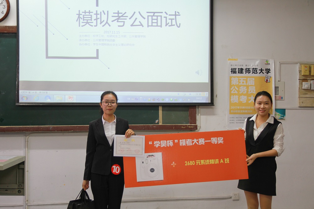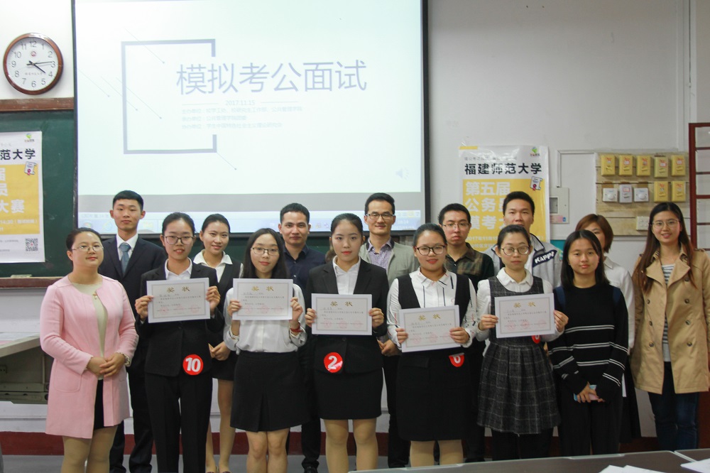11月15日下午,福建师范大学第五届公务员模考大赛决赛暨面试环节在文科楼301教室展开。本活动由校学工处、研工处、公共管理学院联合主办,通过笔试环节,从近500名参赛者中选拔出10人参与面试。