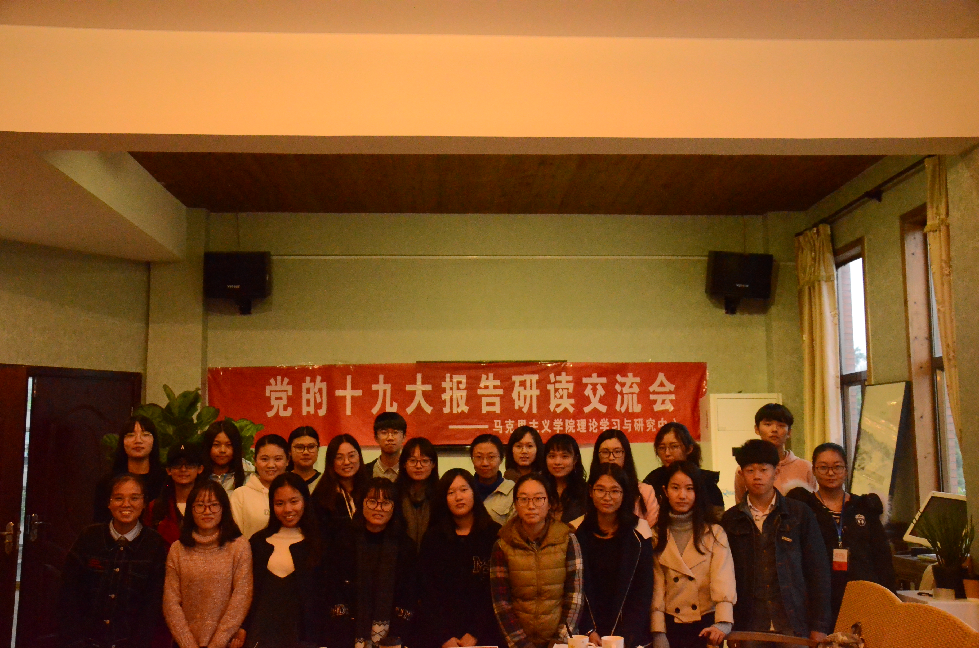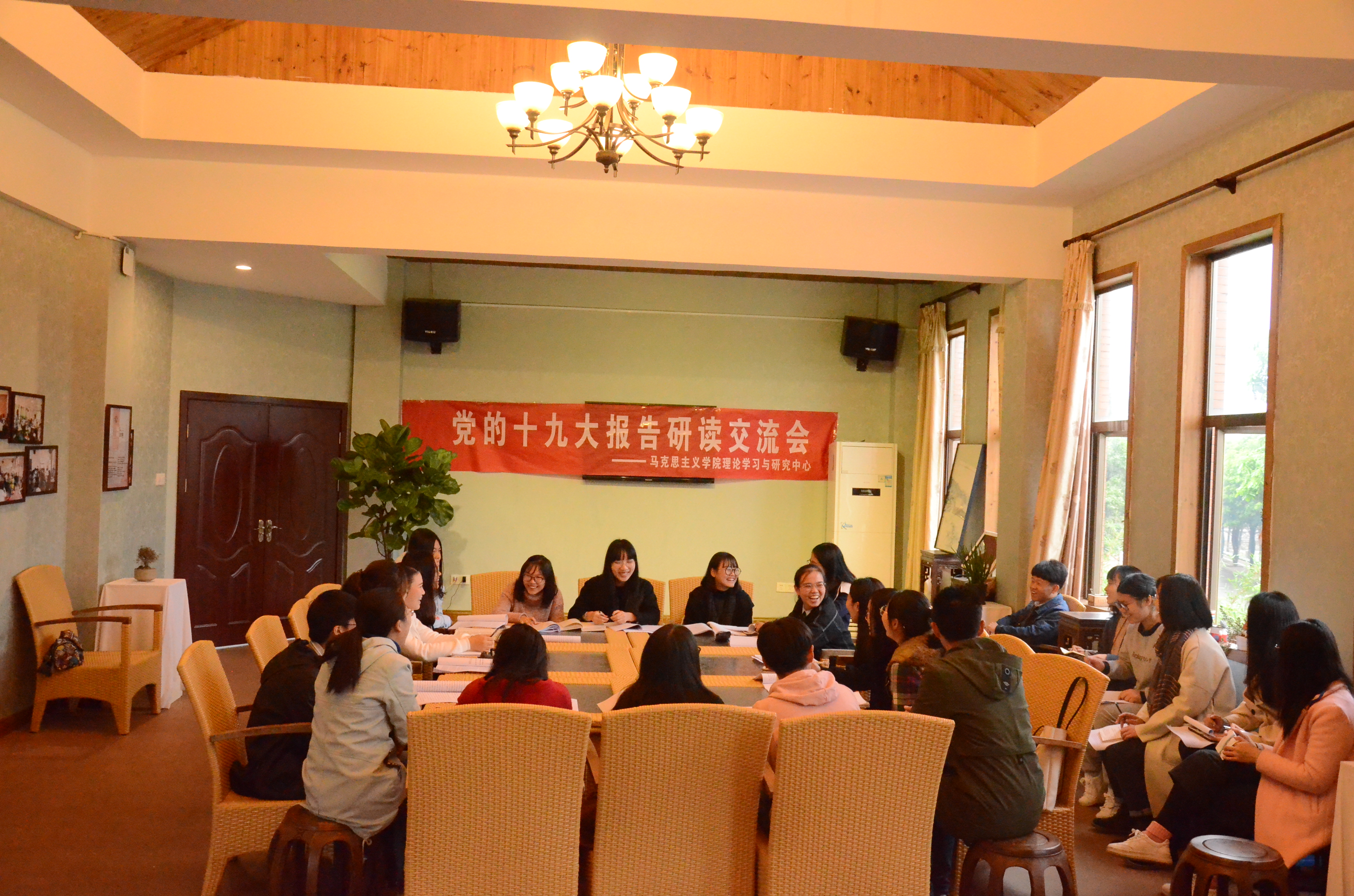 为进一步促进青年学生学习领会党的十九大精神,11月25日下午14:30,马克思主义学院理论学习与研究中心在印象溪源举办了党的十九大报告研读交流会。溪源江畔北风凛冽,但交流会的氛围十分热烈。与会同学们各抒己见,畅所欲言,对十九大报告的内容有了更为深刻的理解。交流内容既基于报告又深入实际,充分联系自身学习生活经验。
