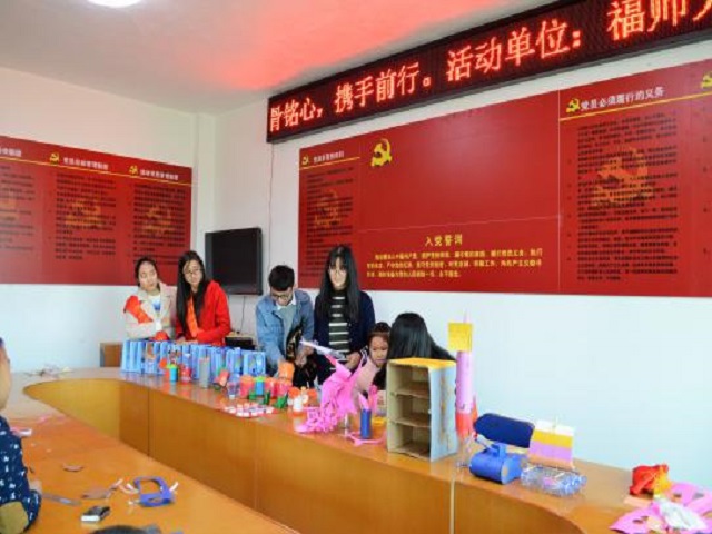 12月10日上午,在经济学院青年志愿者中心工作人员的组织带领下,经济学院志愿者和福建农林大学机电工程学院的志愿者于葛岐村顺利开展了主题为“‘课’骨铭心,携手前行”的志愿活动。本次活动以废物利用再制作的形式开展,得到了广大市民的踊跃参与。