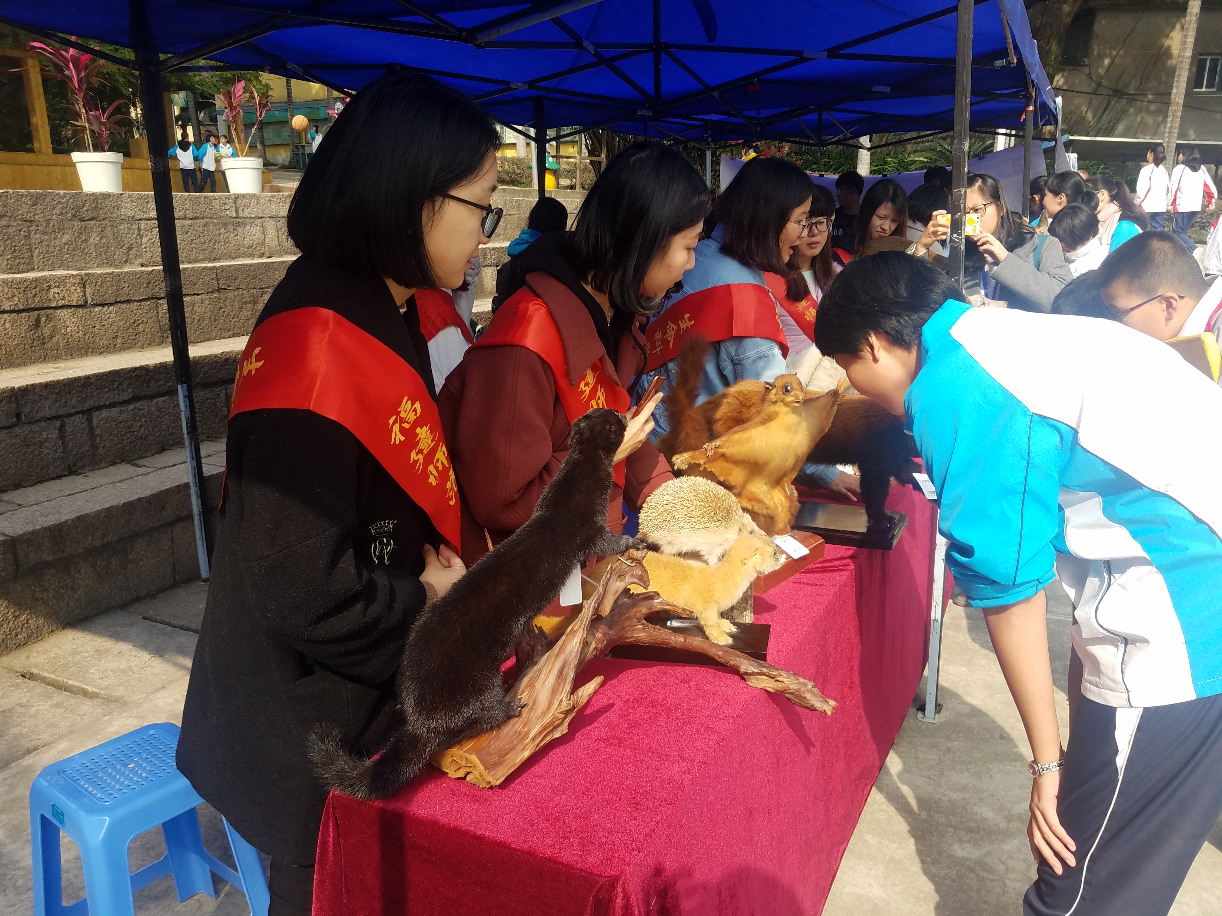 活动开始前,工作人员早早来到现场,在福州时代中学摆起了多种野生动物标本及相关挂,一切准备就绪;活动刚开始,周围便已围满了参观的同学,现场还配有专业的志愿者讲解员在旁讲解;工作人员还为同学们准备了三个与野生动物保护知识相关联的趣味小游戏:“我要回家”、“猜猜我在哪儿”、“依法禁猎”;与此同时,工作人员还准备了动物剪纸的现场教学,同学们选择了喜欢的动物进行裁剪以作纪念。活动的最后同学们都表示很开心,因为此次活动能让他们在紧张的学习生活中得到放松,更是在课余时间学到了平时课堂上很少讲的知识。