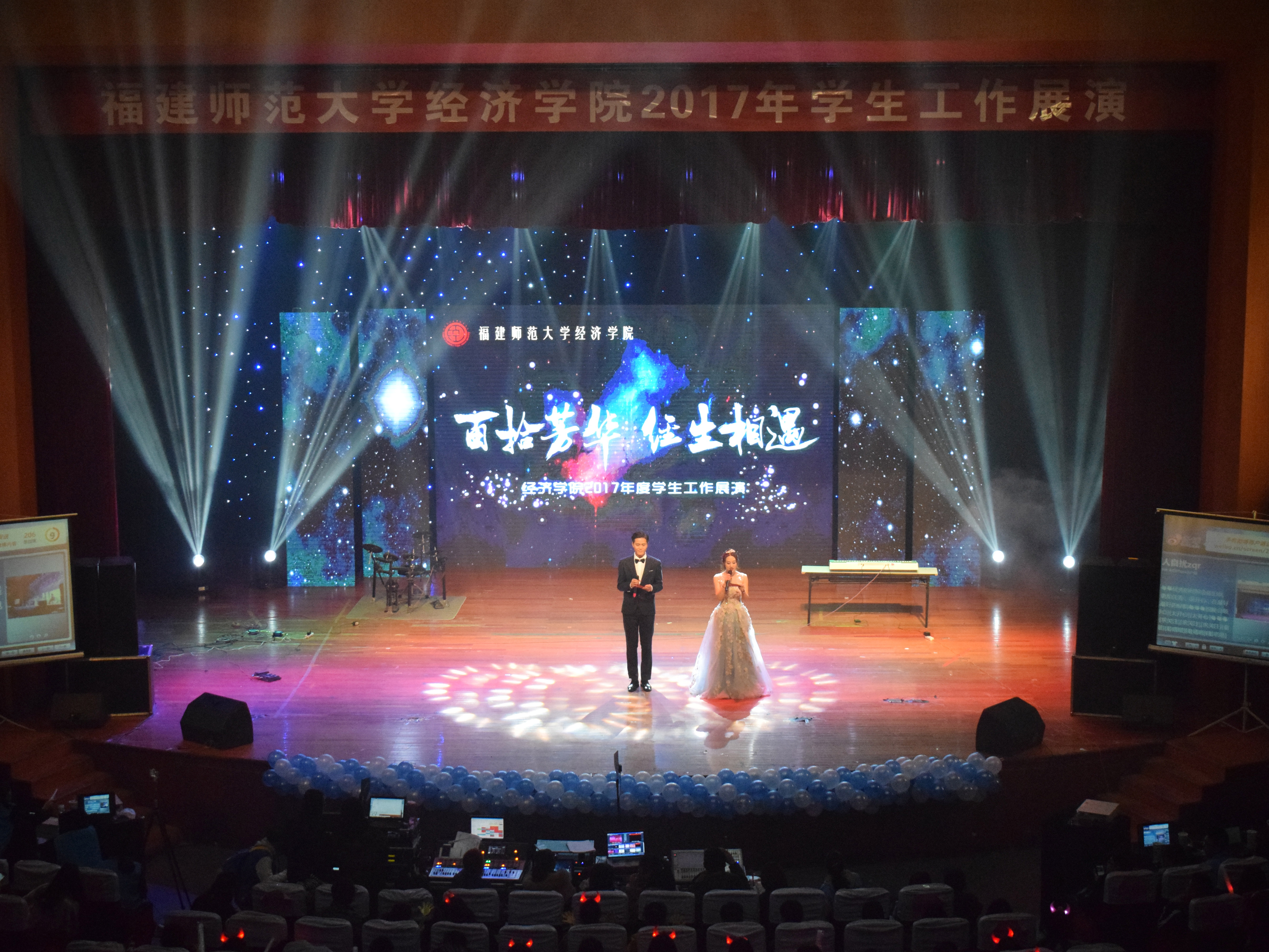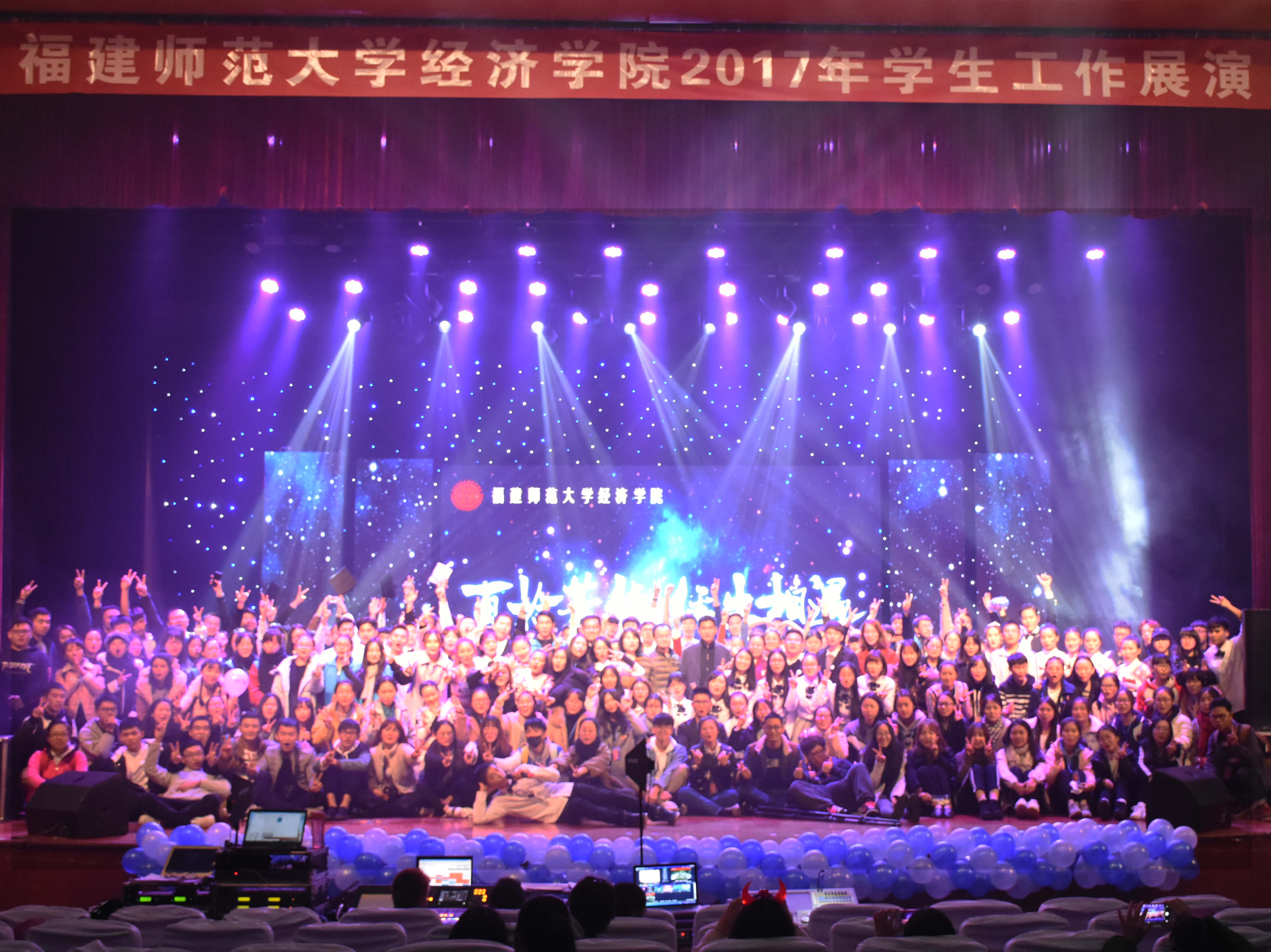 12月20日晚,经济学院于图书馆大会堂隆重举行以“百拾芳华,经生相遇”为主题的2017年学生工作展演。经济学院党委书记赵立新,副书记张清国,副院长黄瑾、颜隆忠,院工会主席杨强,院务委员章竟、王珍珍等领导,以及经济学院师生代表共计1000余人到场观看演出。