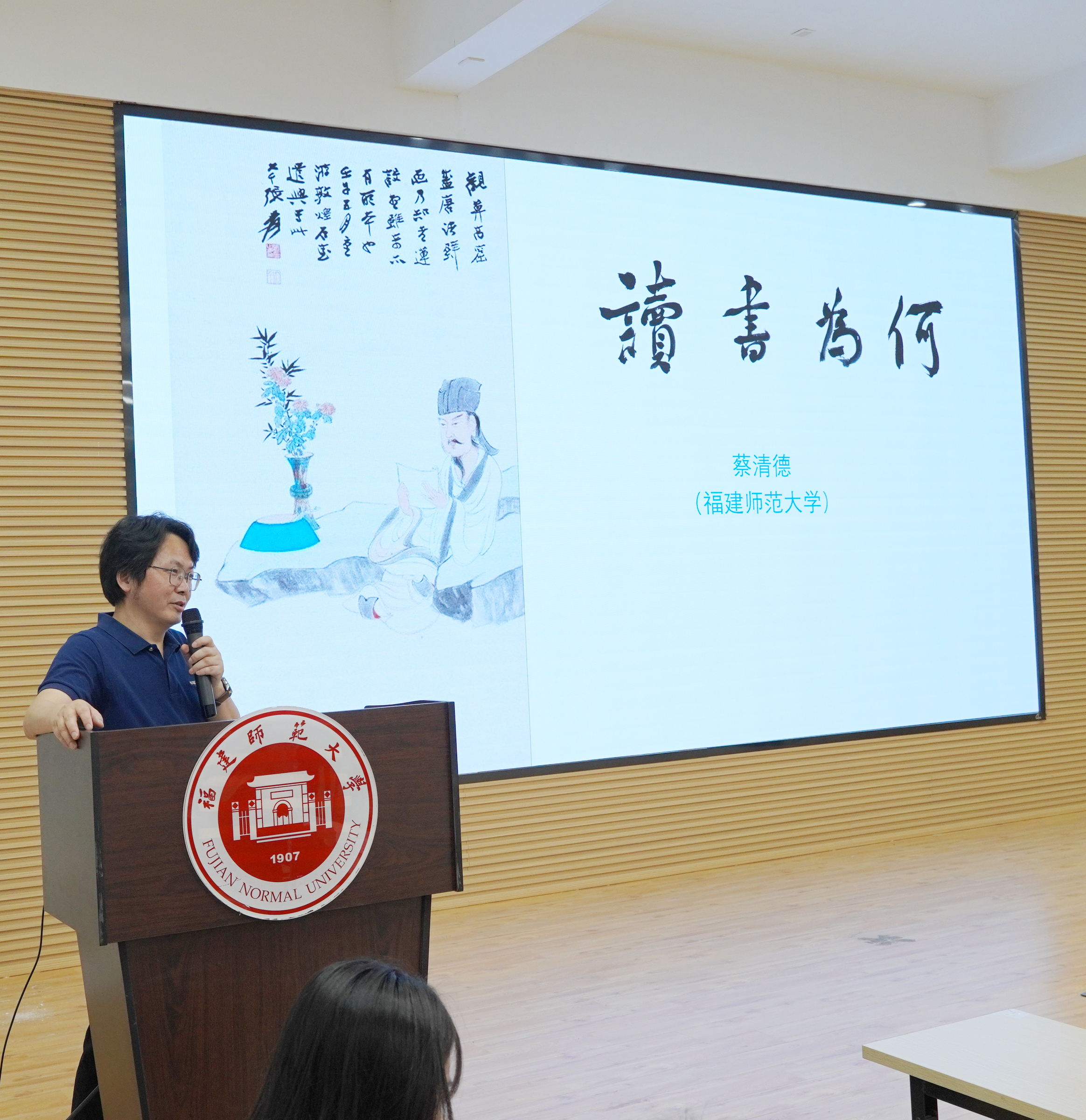 活动中,蔡清德教授围绕“读书为何”这一主题,分别从四个方面分享了自身读书经验和心得。一是“为什么读书”。蔡清德教授从古人读书佳话入手,旁征博引、引经据典,向同学们讲述了读书的价值和意义。二是“读什么书”。蔡清德教授结合自身求学、访学和做学问的读书经验,认为读书应以兴趣爱好为导师,在广泛涉猎的基础上聚焦专业领域,同时也要触类旁通。三是“如何读书”。蔡清德教授认为读书要讲究方法,要真正做到“眼到、口到、心到、手到”,提高读书的效率。四是“读书、问题意识、材料与写作的有机统一”。蔡清德教授结合鲜活案例分析了读书与问题意识、材料整理之间的关系,以及三者对于学术研究、论文写作的重要作用。