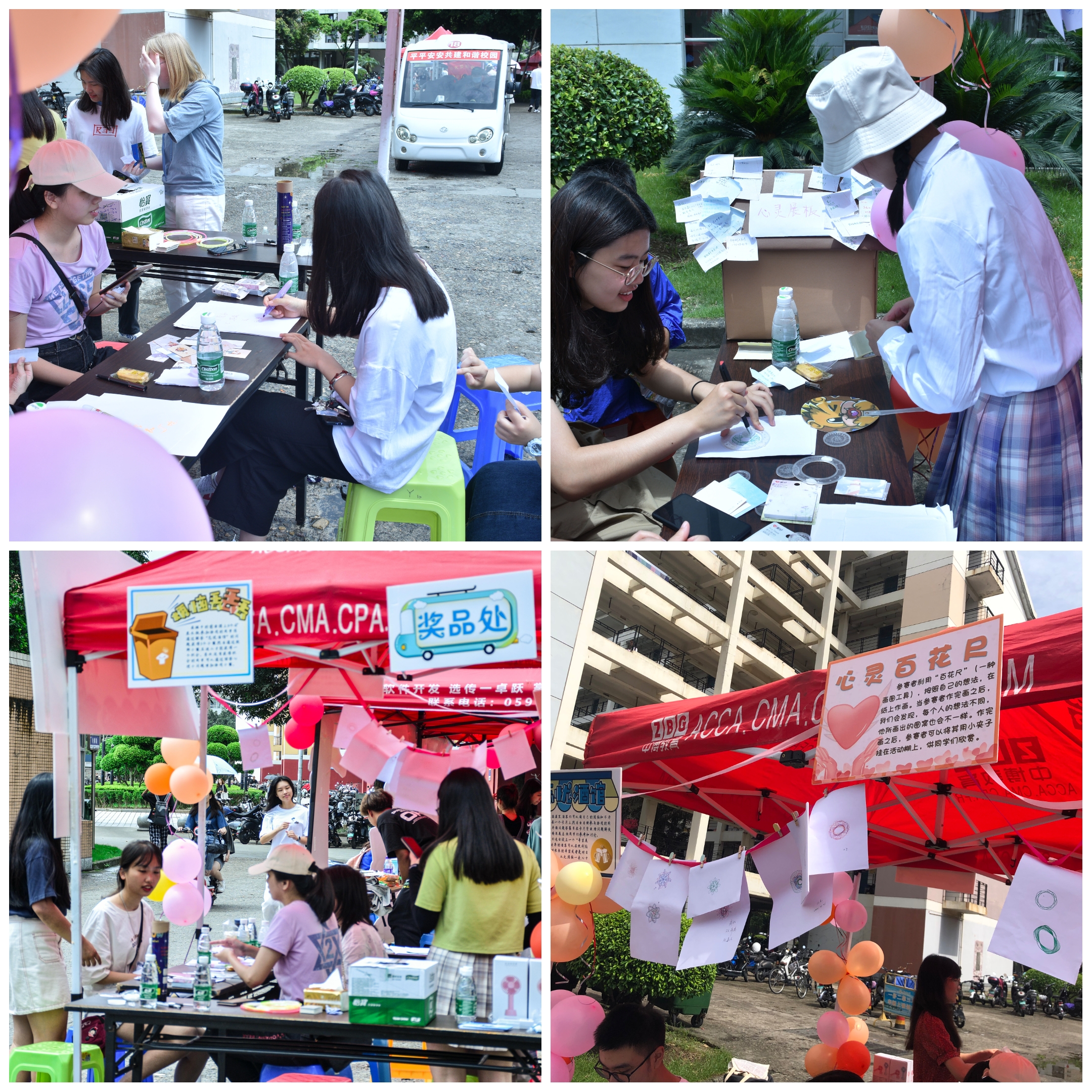本次嘉年华主要由“忘忧酒屋”、“烦恼丢丢丢”、“心灵百花尺”、“心有灵犀一点通”四个环节组成。在“忘忧酒屋”环节中,同学们将烦恼写在卡片上,在游戏后分享讨论,并设有“希望展板”供同学们书写对未来的希望和祝福;在“烦恼丢丢丢”环节中,同学们通过投掷小圈舒缓心中压力;在“心灵百花尺”环节,参赛者利用“百花尺”在纸上作画,展现不一样的自我;在“心有灵犀一点通”环节,两名参与者通过合作传达图片内容,拉近彼此的距离,体会团队合作的重要性。此外,活动现场为参与同学准备了具有经济学院特色的周边文创礼品,鼓励同学们积极参与,活动现场氛围热烈。
