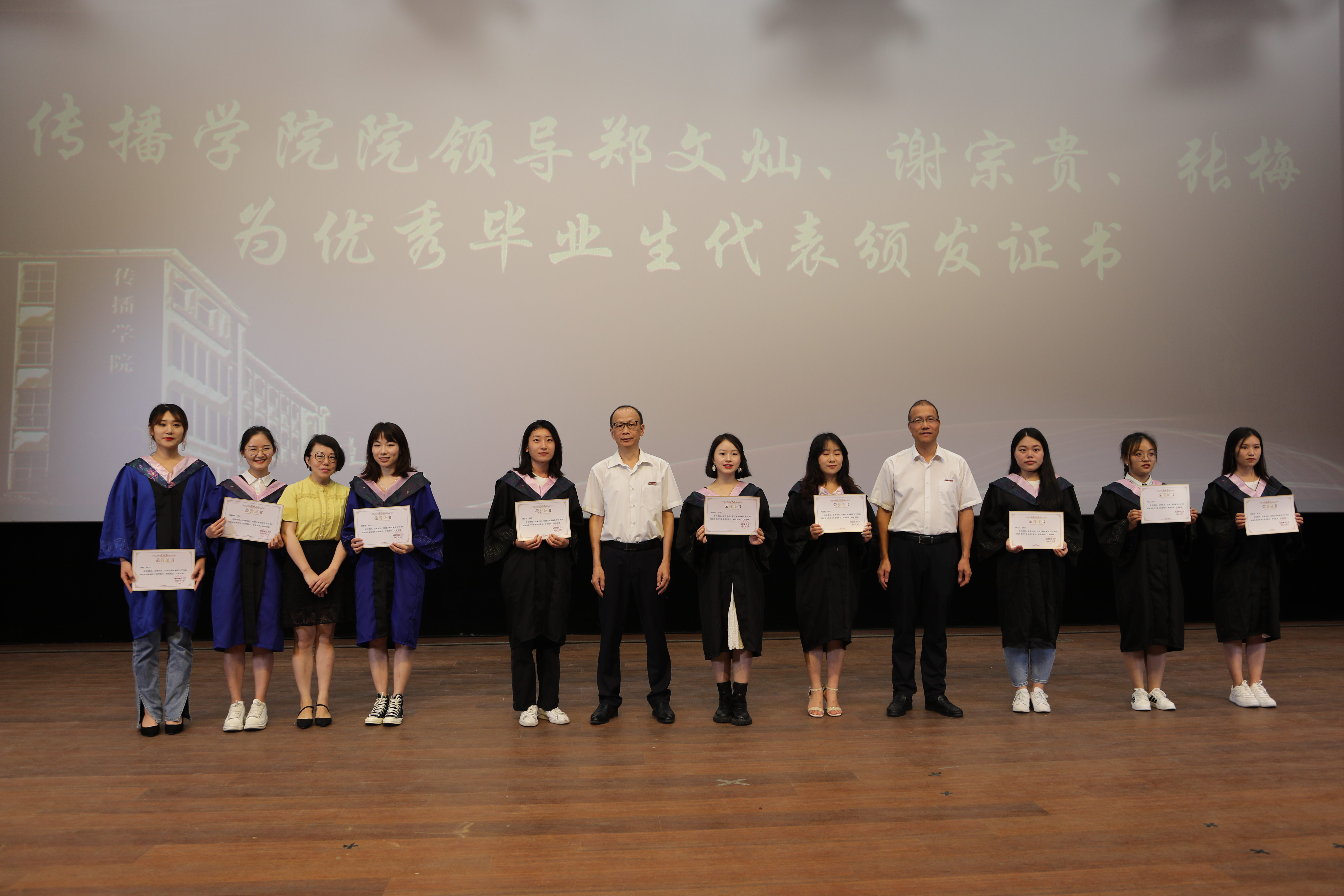 毕业典礼中,学院党委书记郑文灿宣读了2021届优秀毕业生名单,并与院长谢宗贵、副院长张梅一同为优秀毕业生颁发了证书。2019级播音与主持艺术专业学生代表带来慷慨激昂的朗诵《船歌》,2017级播音与主持艺术专业学生代表带来感人肺腑的歌曲《凤凰花开的路口》,回首笑泪交织校园青春,回想旗山大道绿树成荫,回忆星雨湖畔熠熠波光。