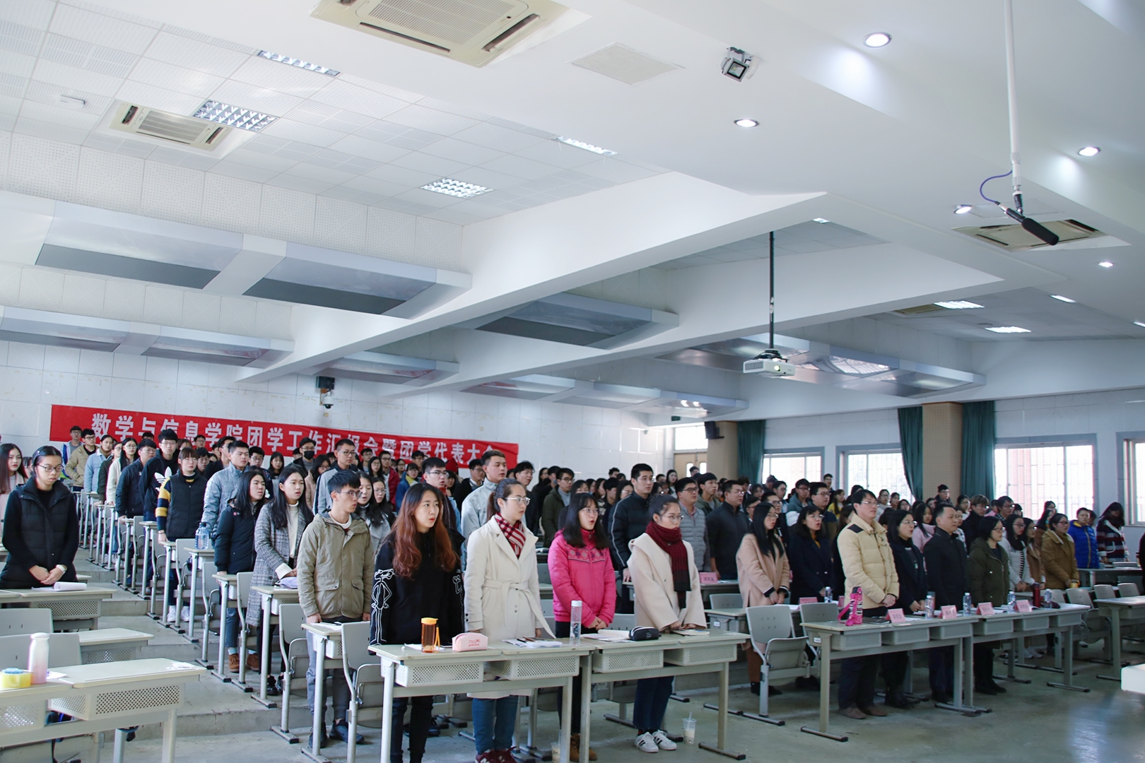 1 月 10 日下午,数学与信息学院 2017—2018 学年第一学期团学工作汇报会暨团学代表大会在知明 2—202 举行。学院党委副书记张兆文老师,学院团委书记陈林婕老师,各年级辅导员以及全体学生干部共200多人出席了此次大会。