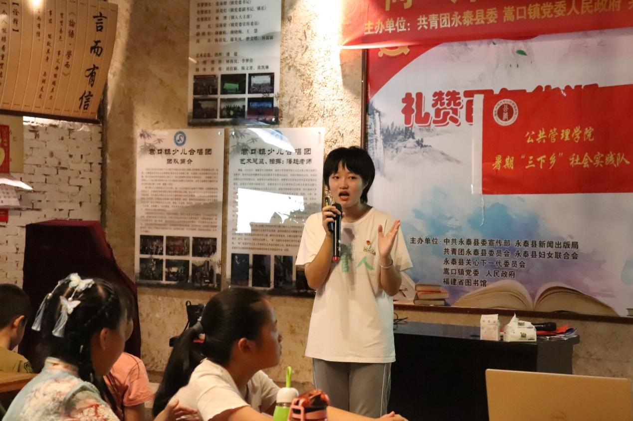 为庆祝中国共产党成立一百周年,传承红色精神,赓续革命传统,推动党史学习走深走实,2021年7月16日,福建师范大学公共管理学院“公心益行”暑期社会实践队携手福建义工支教团,走进福州市永泰县嵩口镇公益社区图书馆,开展以“学党史故事,扬红色精神”为主题的党史学习宣讲活动。来自嵩口镇中心小学的32名学生参与本次活动。