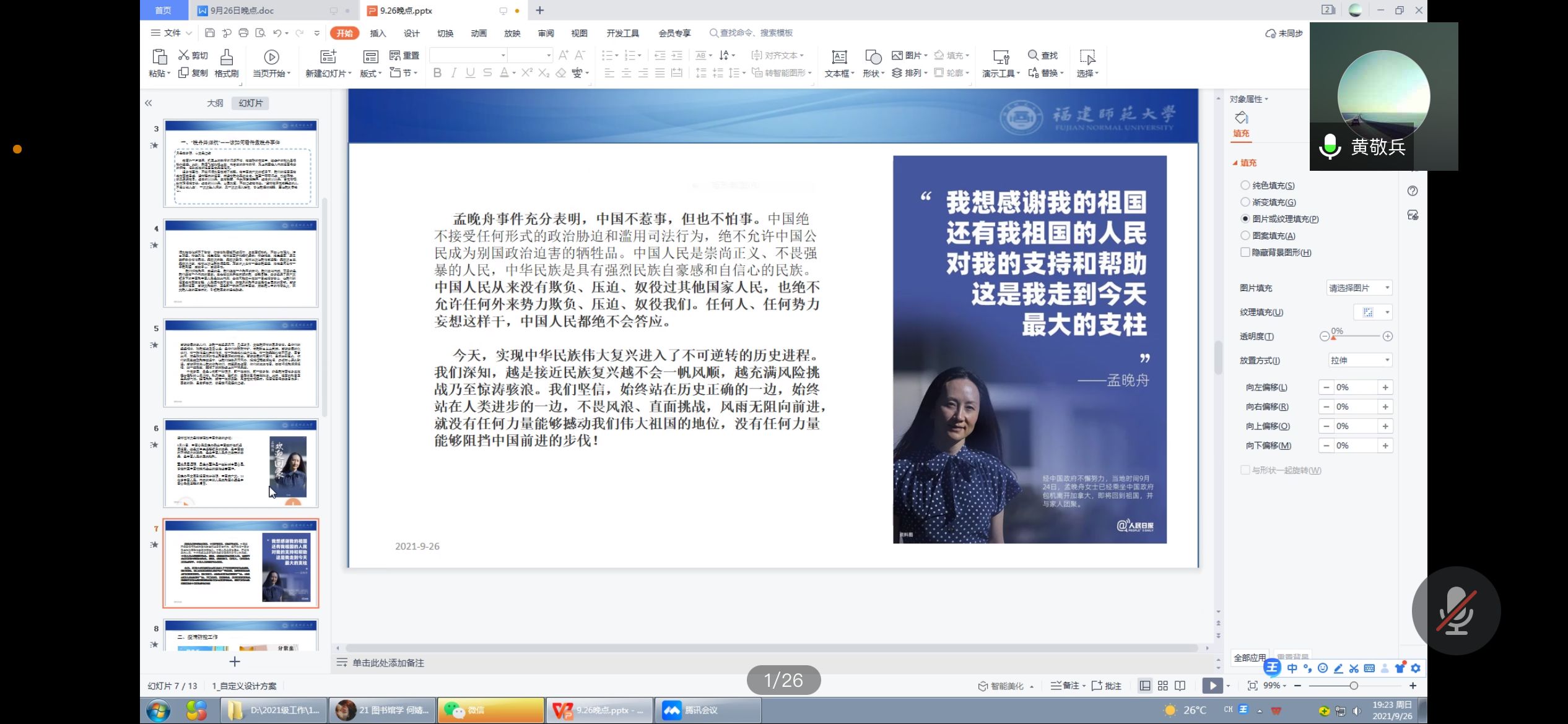 “正是那一抹绚丽的中国红,燃起我心中的信念之火,照亮我人生的至暗时刻,引领我回家的漫长路途。”9月26日晚,社会历史学院本科2021级以时政热点“孟晚舟归国”为契机开展了一次别样的线上主题教育活动。图书馆学专业何婧茹同学在线上深情朗诵了孟晚舟女士朋友圈文章《月是故乡明,心安是归途》,带大家重温了孟晚舟女士感人的归家宣言。辅导员黄敬兵老师梳理了“孟晚舟事件”的前因后果,他指出,三年来,中美关系跌宕起伏,孟晚舟事件的实质,是美国试图阻挠甚至打断中国发展进程,正是由于中国国力的强大与中国政府的不懈努力,晚舟才终得归航。“何静茹同学精彩的朗诵和黄导声情并茂的讲述,让我们热血沸腾,深受鼓舞”同学们在直播间积极参与互动“祖国有力量,人民有依靠”“深切感受到了祖国的强大,发自内心的为祖国感到骄傲”“中国不惹事,但也不怕事”