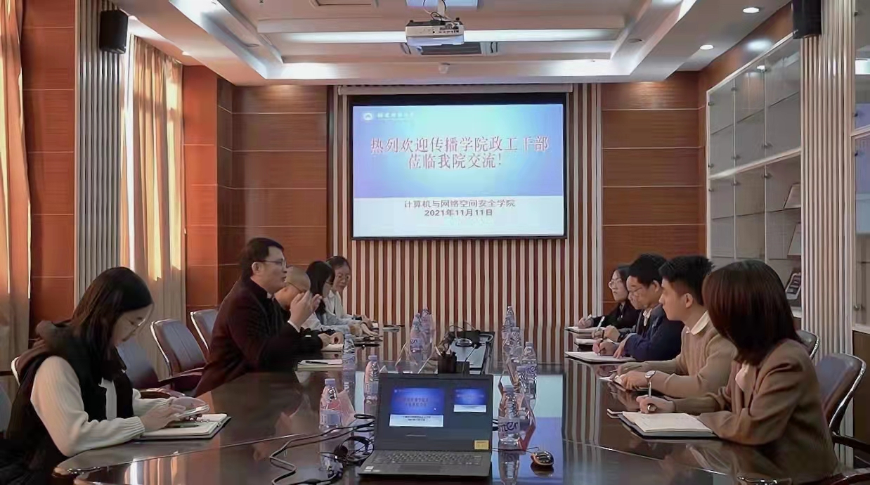 11月11日上午,为进一步加强和改进新形势下学院辅导员队伍建设,传播学院党委副书记谢秀俤带领辅导员一行5人,前往计算机与网络空间安全学院开展座谈交流。计算机与网络空间安全学院党委副书记(主持工作)俞建群及全体辅导员参加会议。