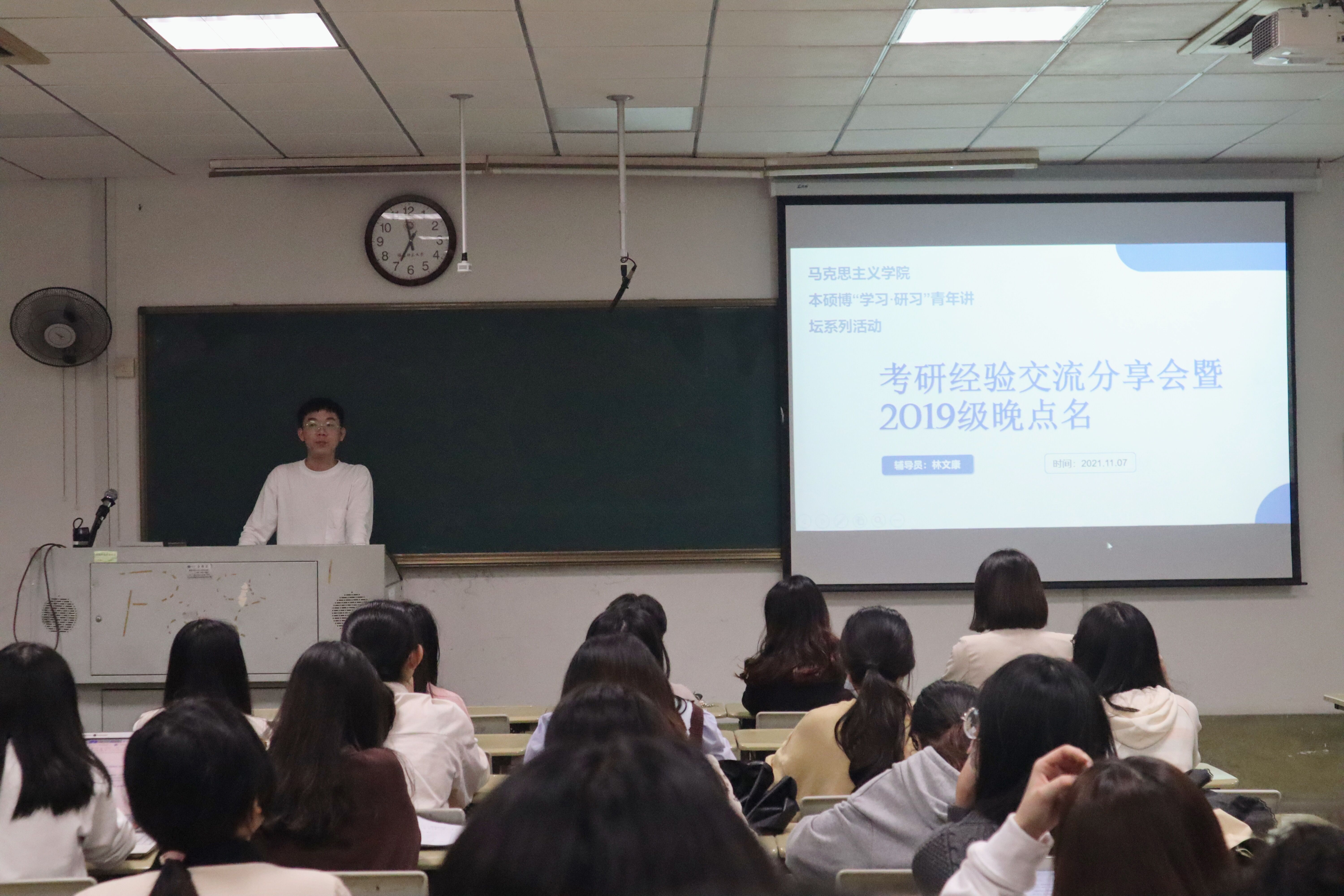 11月8日晚,马克思主义学院在旗山校区笃行楼教室开展本硕博“学习·研习”青年讲坛系列活动之考研分享会。本次讲坛由学院2020级国外马克思主义专业研究生、2019级兼职辅导员林文康主讲,2019级全体本科生参与分享会。