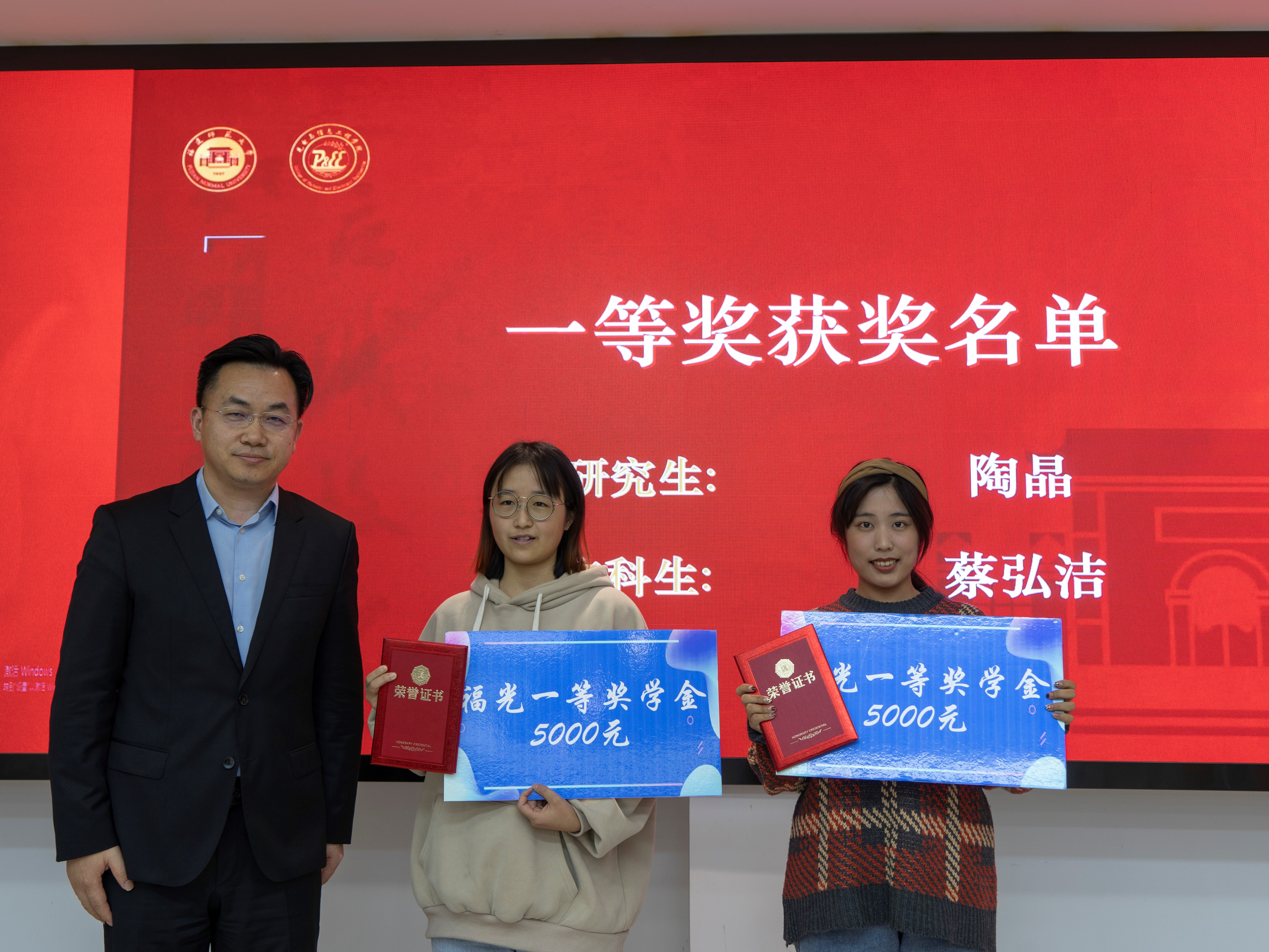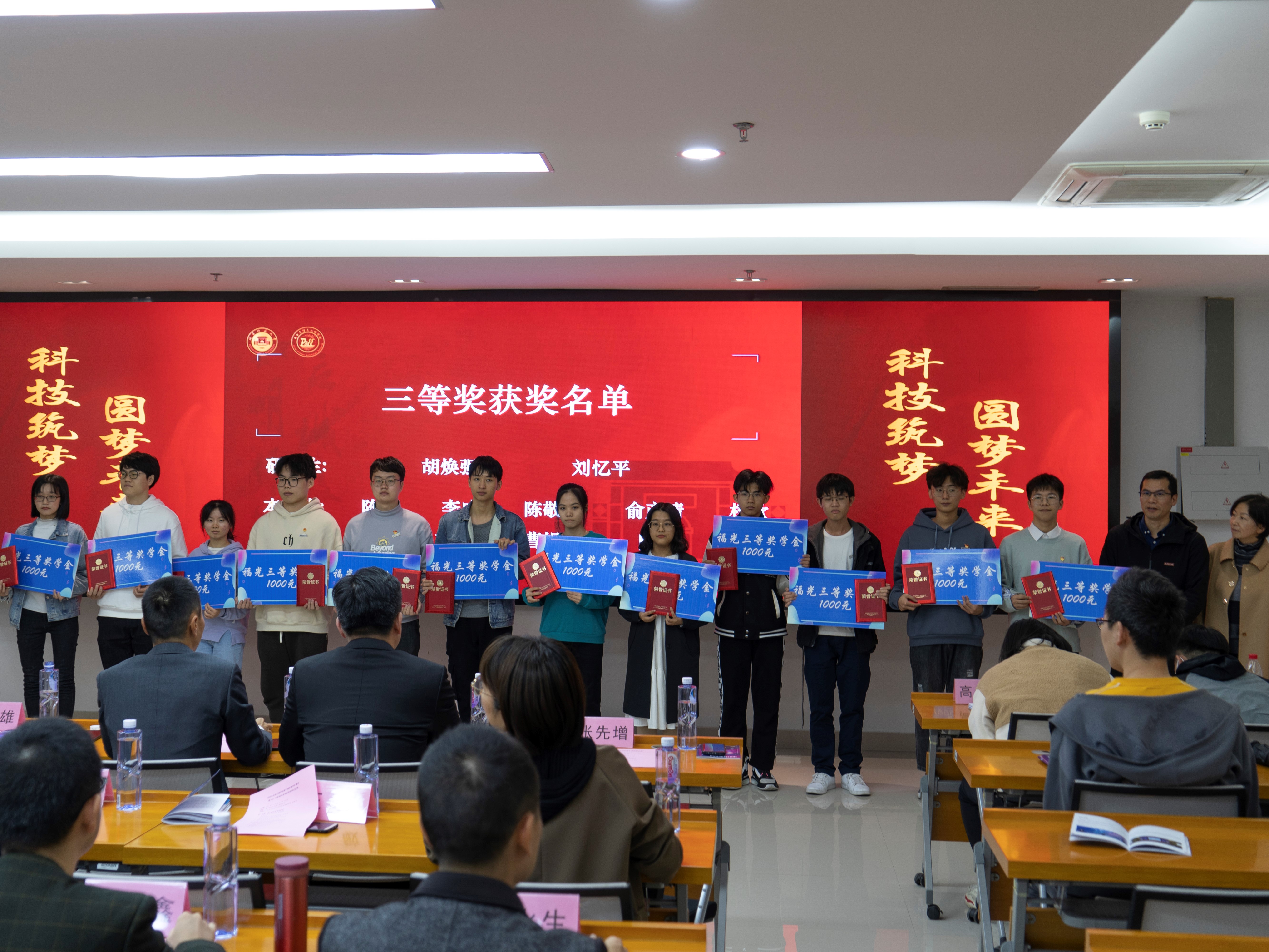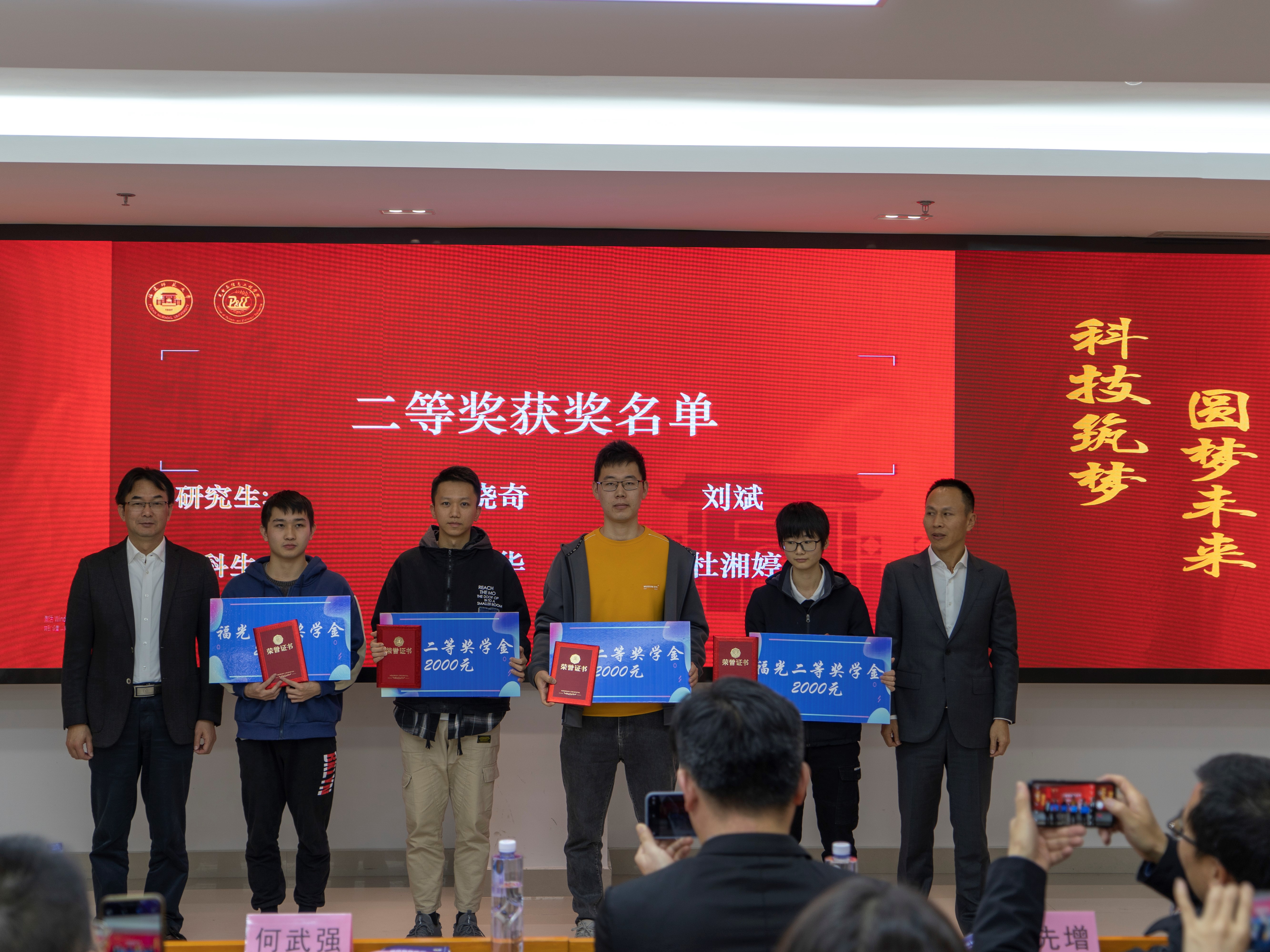 开幕式结束后举行了2021年度福光奖学金颁发仪式,学院党委侯建雄书记宣读2021年度福光奖学金获奖名单。福光集团执行总裁苏尚华先生、福光股份有限公司副总经理何武强先生等领导嘉宾分别为获奖同学颁发证书及奖金。