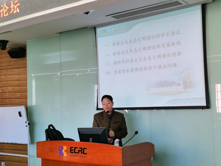 黎元生教授以“社会主义生态文明理论的创新与发展”为主题,从“阶段论”、“制度论”和“状态论”三个维度阐释了生态文明的概念内涵,梳理了社会主义生态文明理论的学术源流和发展脉络,重点介绍了新时代社会主义生态文明理论的最新成果——习近平生态文明思想的理论体系和核心要义,最后简要介绍了当前学术界关于生态文明理论研究的热点、难点和疑点等问题,启发了大家的思考,引起了广泛的共鸣,为在座师生进一步开展生态文明理论与实践研究提供了重要的学术指引。