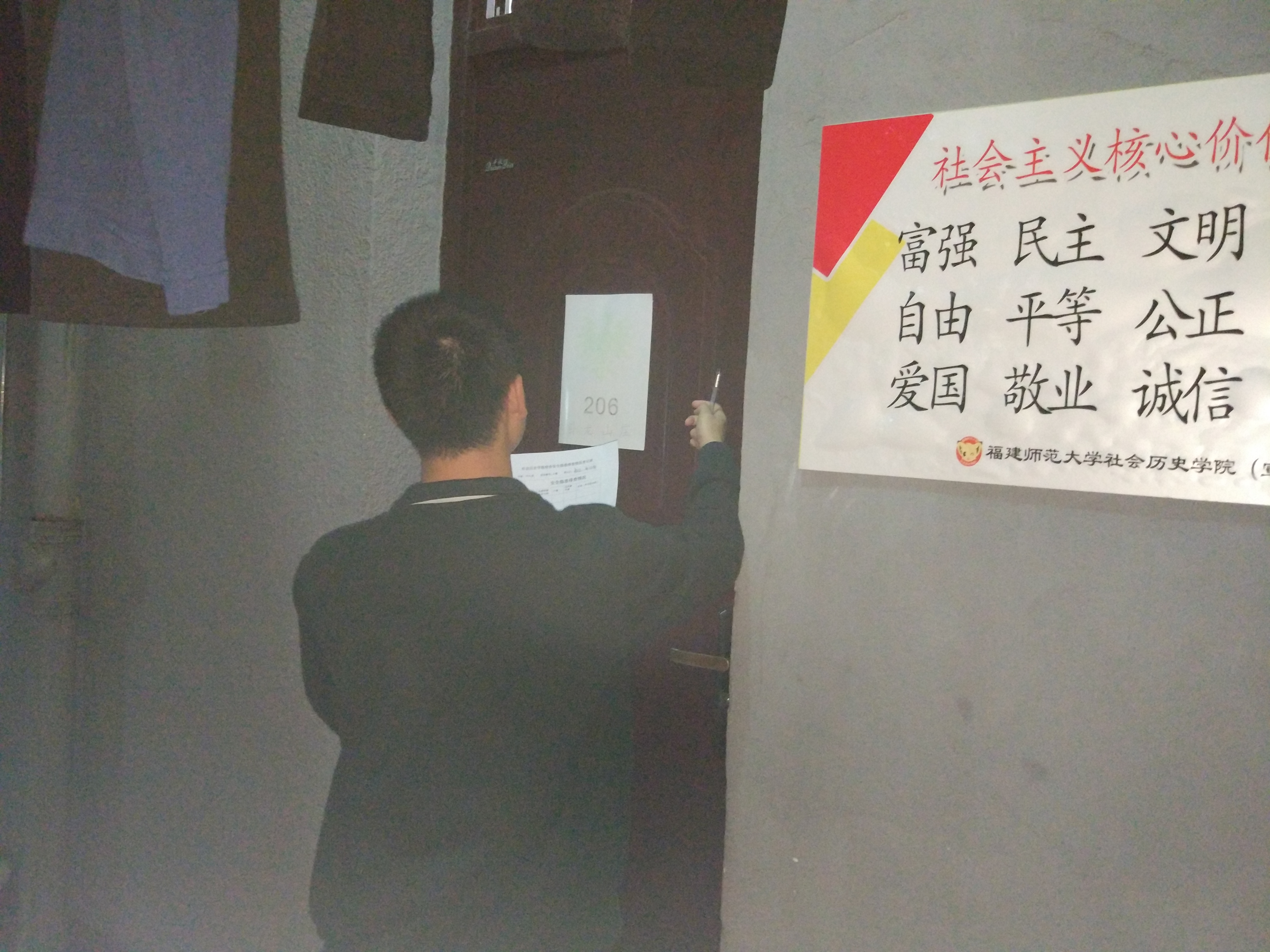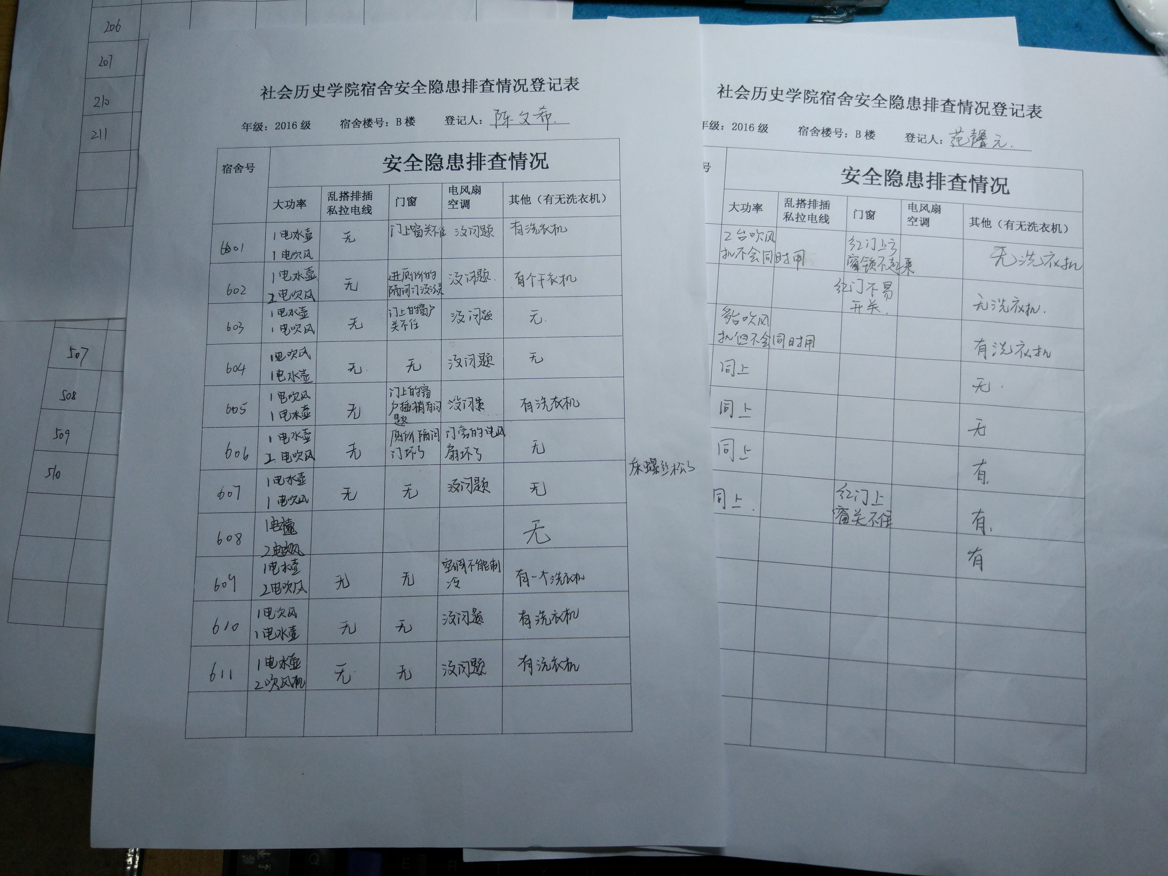 2017年3月20日,为了进一步加强学生宿舍安全管理,营造安全、文明的生活环境,消除安全隐患,创建平安和谐校园。社会历史学院2016级安保部于学生宿舍B楼开展了宿舍安全隐患排查活动。