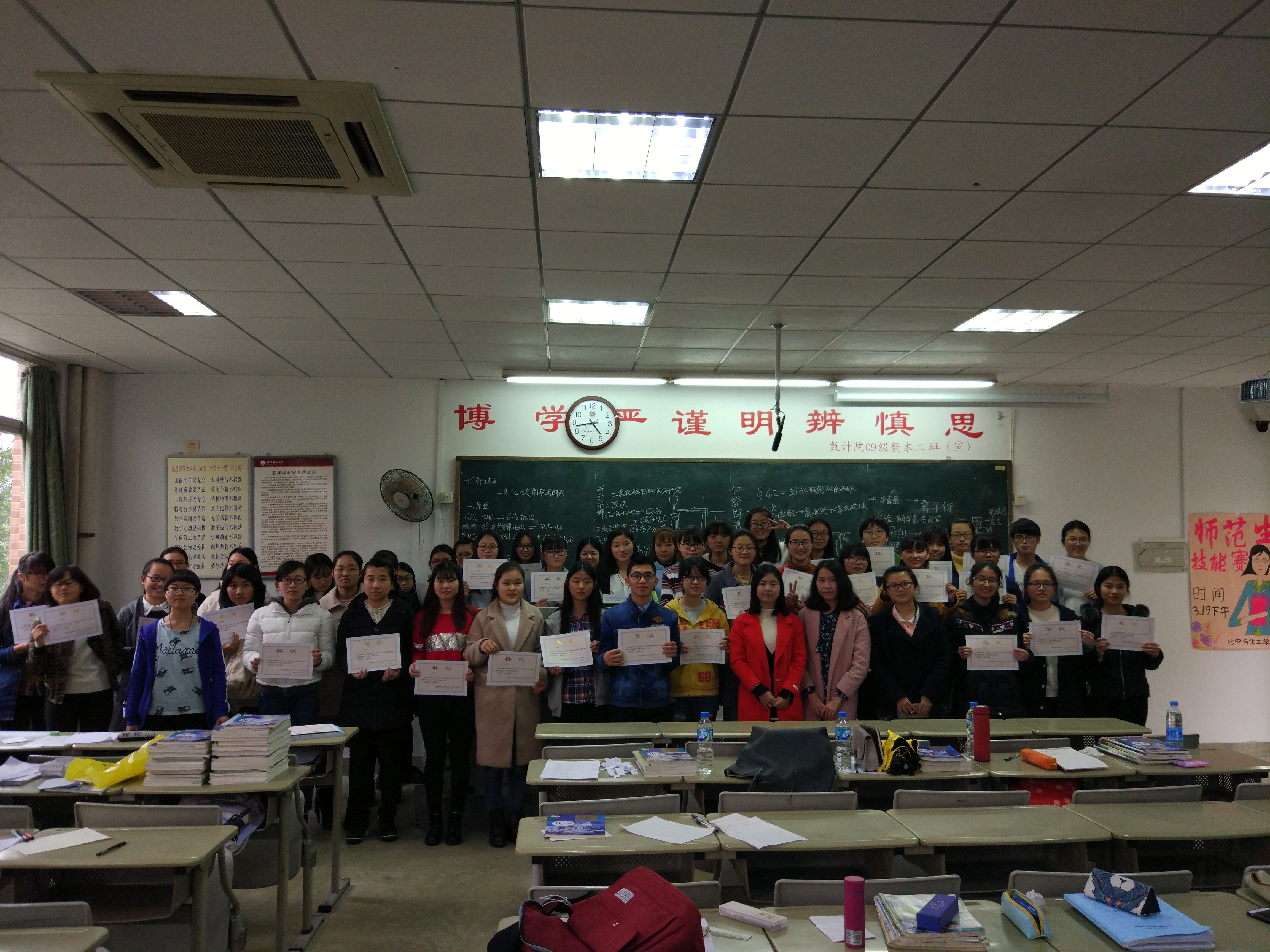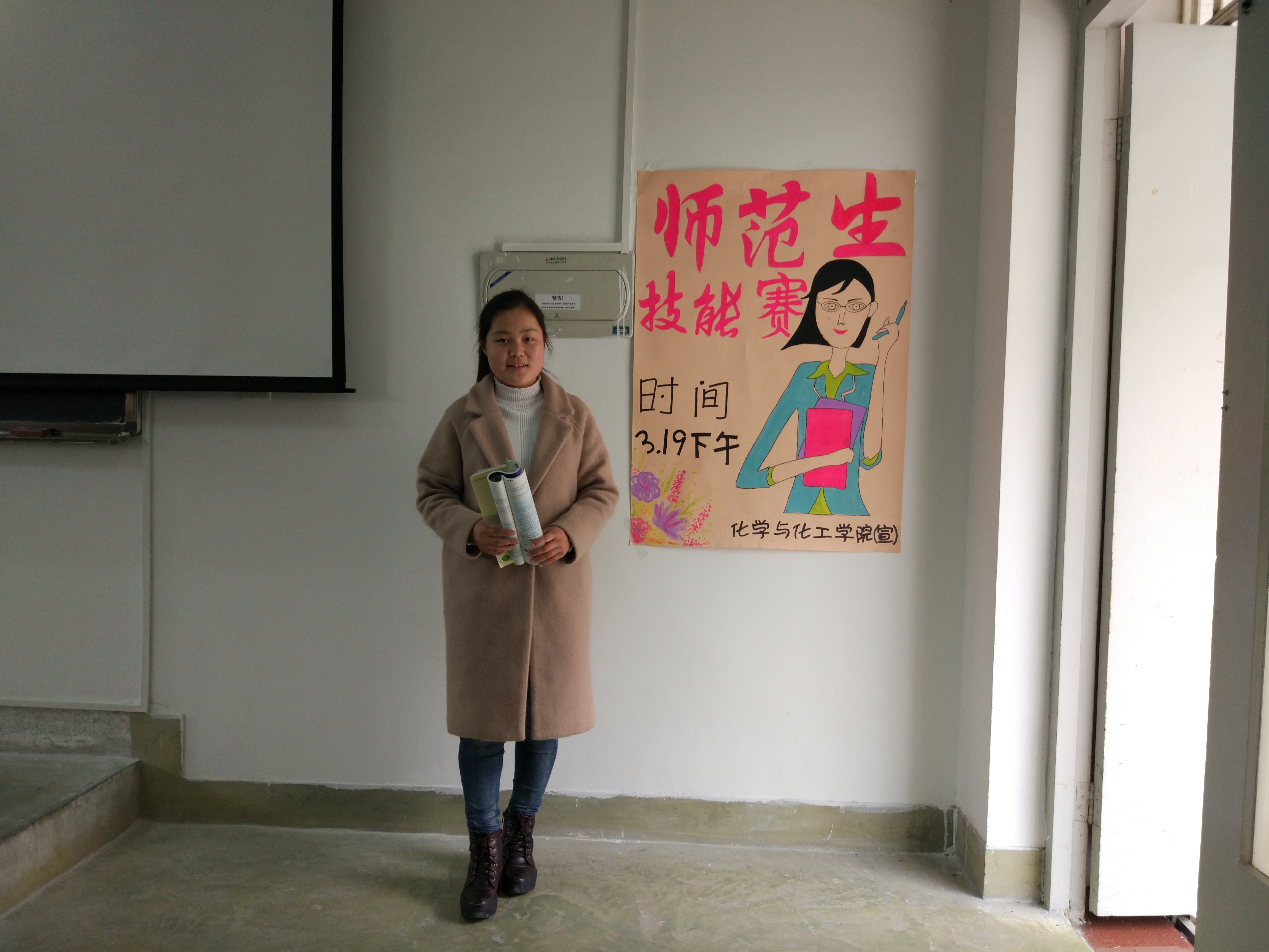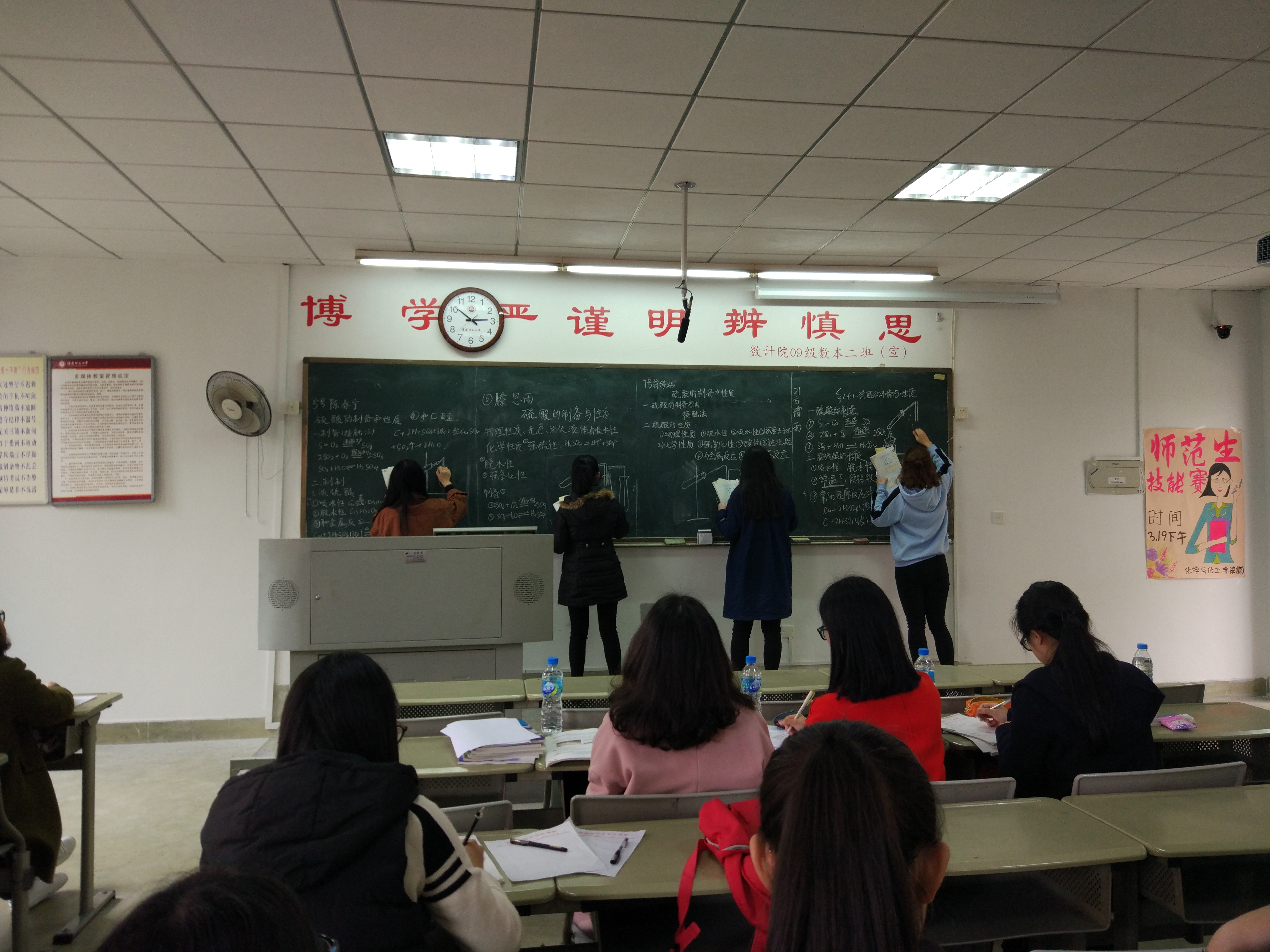 3月19日,化学与化工学院2016级板书板画教学技能赛于笃行1-204举行。2013级同学吴秋玲,陈思雨及2014级同学凌聆担任比赛评委,化学与化工学院16级化学教育专业全体同学观看此次比赛。