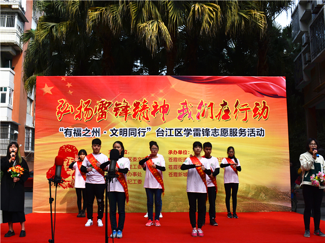 2017年3月4日,环境科学与工程学院的志愿服务团队来到苍霞新城社区,参加了由中共台江区委文明办、苍霞街道党工委、苍霞街道办事处、苍霞街道纪工委主办,由苍霞街道工会、团委、妇联、苍霞街道家园事务服务中心、苍霞新城社区承办的“有福之州,文明同行”台江区学雷锋志愿服务活动。
