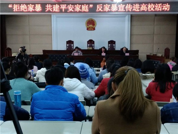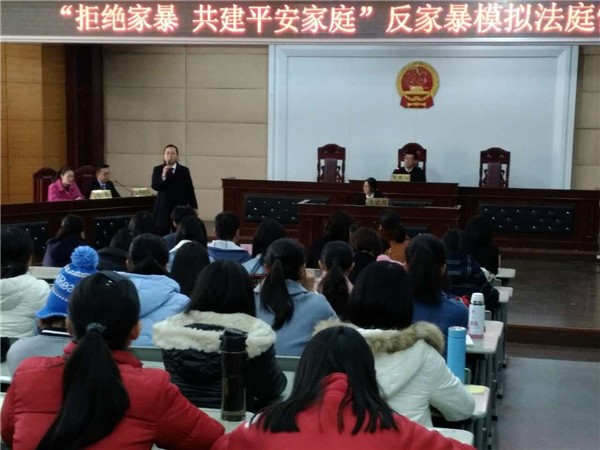 活动由我院团委书记梁莹老师主持,市妇联副主席娄月琴为活动致辞。娄副主席说,《反家庭暴力法》已经正式实施一周年了,这一年全市各级妇联组织齐心协力,开展了上千场相关主题的反家暴宣传教育活动,营造了浓厚的反家暴社会氛围。今天的活动进一步创新形式,用“模拟法庭”情景剧的形式进行普法,希望通过直观生动的表演,进一步提高妇女群众的反家暴知识水平,深化反家暴意识,共建“平安家庭”、和谐社会。
