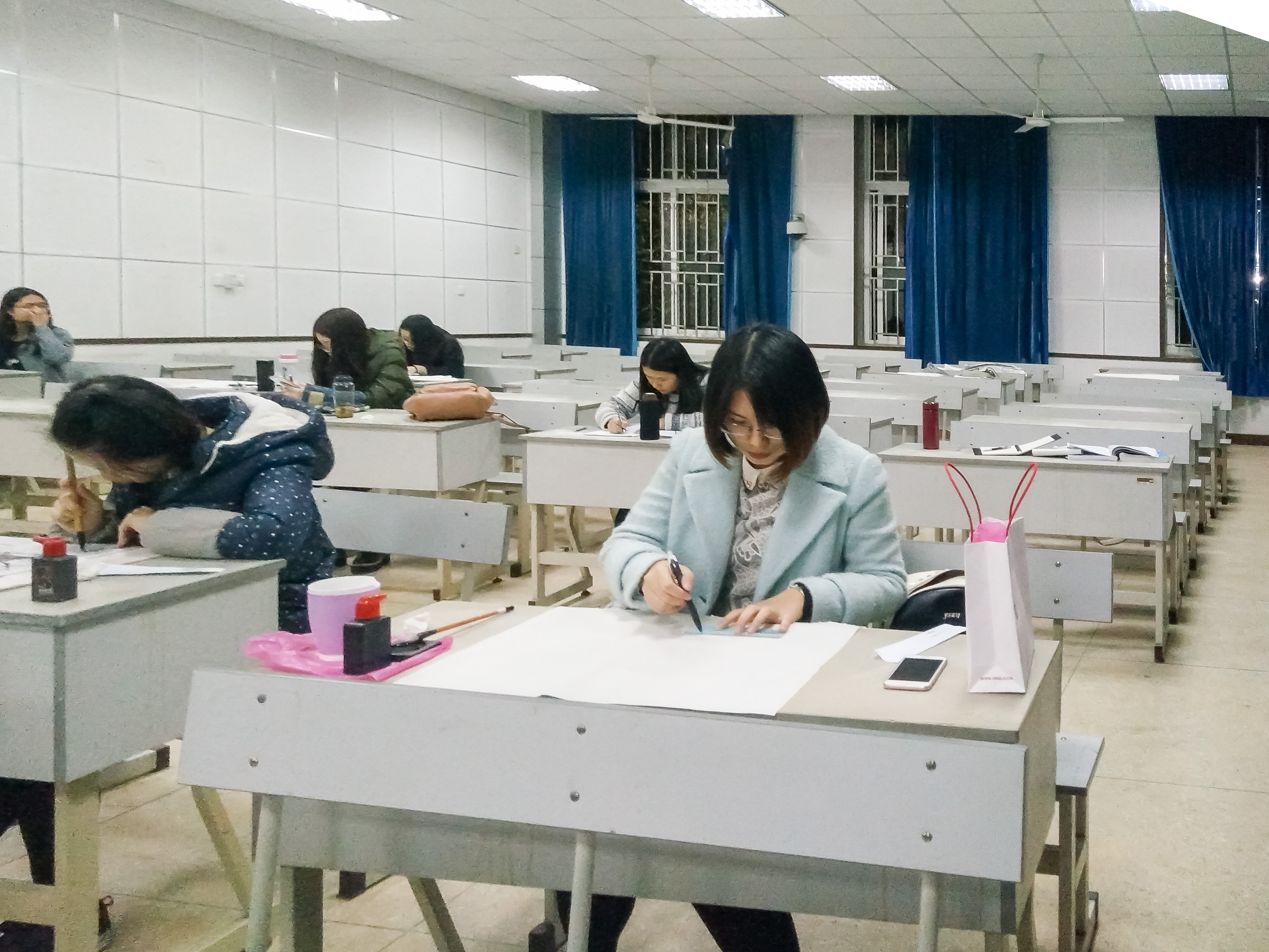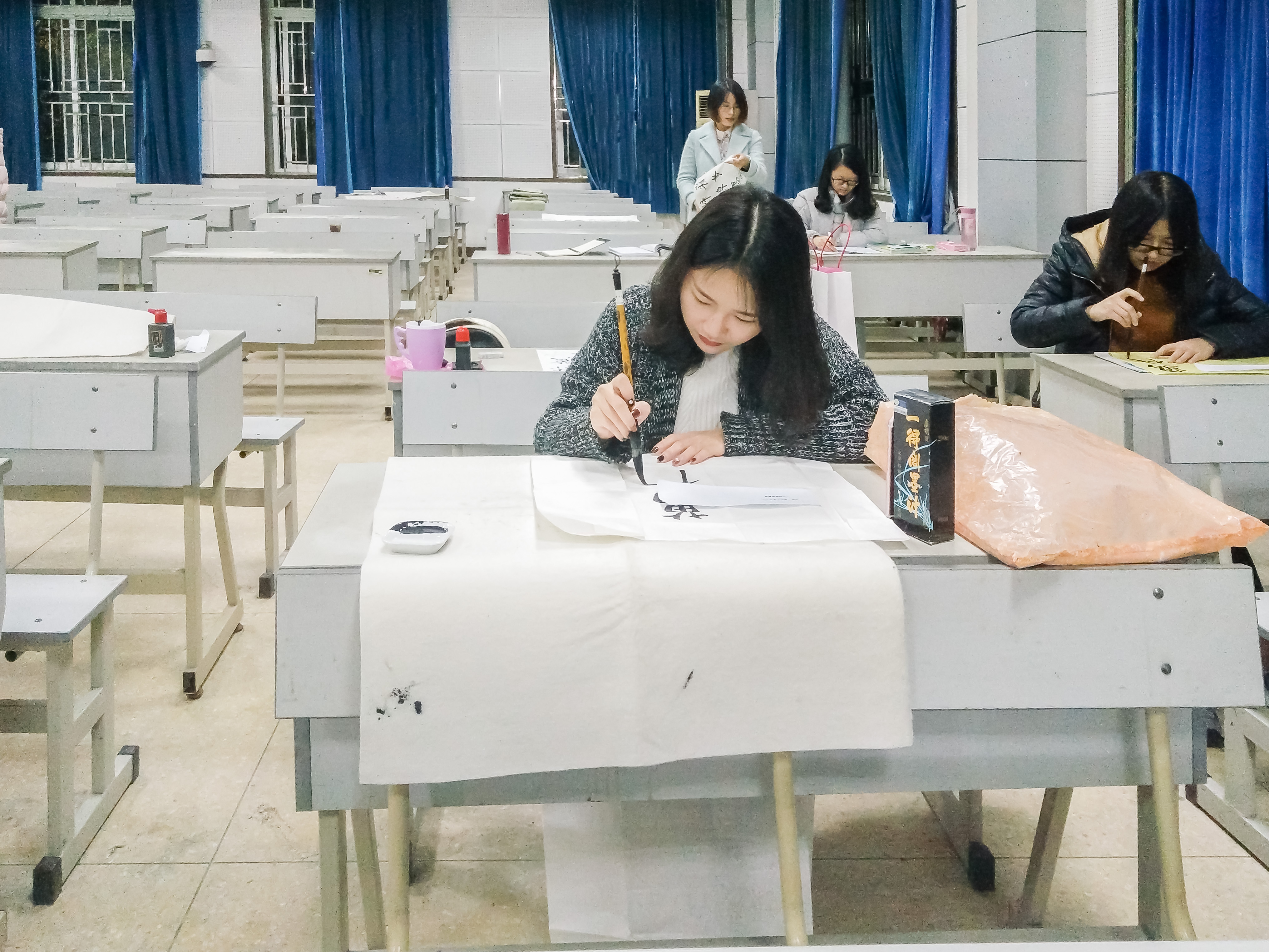 参赛选手们提前到场签到,负责人按不同组分发各自的书写内容并介绍比赛流程后,比赛正式开始。在比赛现场,每位选手都满怀激情地用心书写每一笔笔画,每一个汉字,纸笔摩擦声不绝入耳。毛笔字行云流水,落笔如云烟;硬笔字婉若银钩,漂若惊鸾;粉笔字工整清秀,匀称隽永。选手们出色的作品背后都是日积月累的付出,每个字无不透露着或严谨、或潇洒、或灵动的气质。最后,选手的作品由学习部干事进行拍照并上交给评委评审。