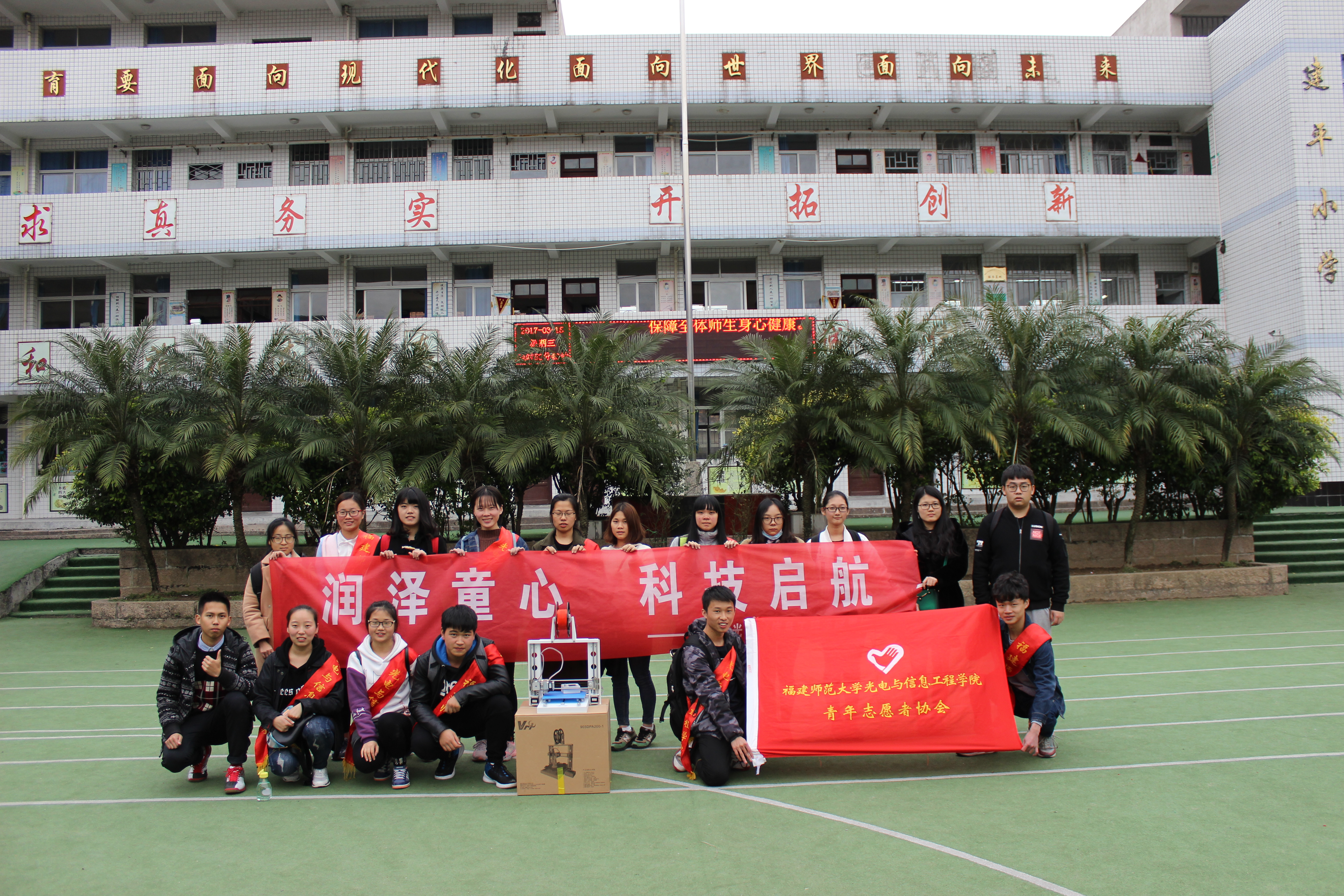 用心体悟成长,用爱呵护未来。为积极响应全社会促进科技进步的新机制,进一步了解和融入社会,2017年3月15日下午,光电与信息工程学院青年志愿者协会特此展开此次“润泽童心,科技启航”特色志愿服务活动。本活动由光电学院青年志愿者协会协会负责人组织志愿者们进入闽侯县上街镇建平小学,为那里的小朋友带来了一场科技的盛宴。