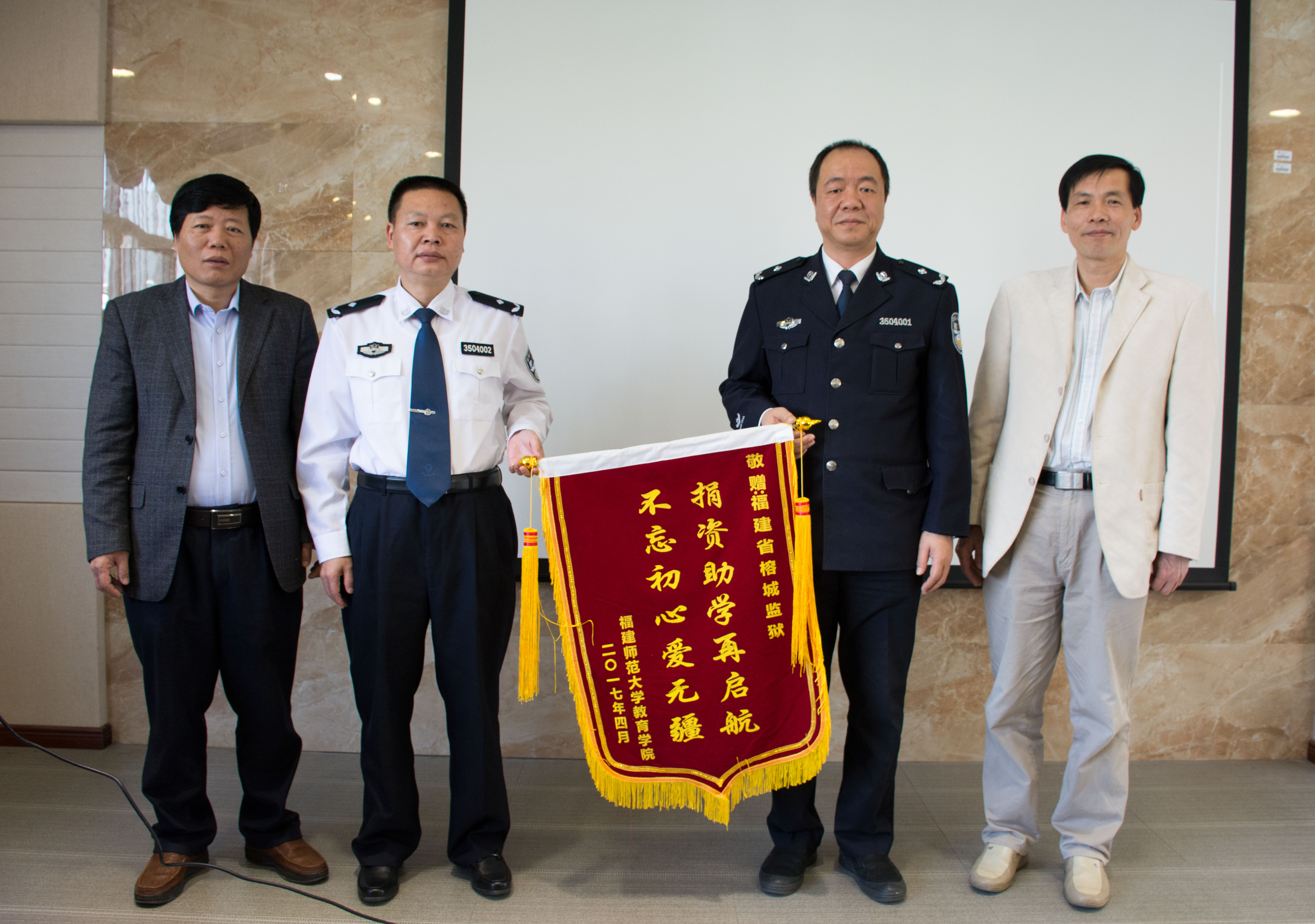 据了解,福建省榕城监狱的警官们每年出资3万元,资助教育学院10名经济困难学生完成大学学业,每人每年3000元,今年已经是福建省榕城监狱第五年“情牵教院”。捐助仪式上,福建省榕城监狱党委书记、监狱长黄一伟先生开场致辞。他先是感谢福建师范大学教育学院多年来对榕城监狱教育改造工作所付出的贡献。他表示捐资助学是一项“励当代,启未来”的公益活动,它既是榕城监狱全体民警职工的共同心愿,也是全社会共同发力的光彩事业。借此机会他勉励同学们要做到追梦前行、敏而好学、衔环结草。随后,福建师范大学教育学院党委书记叶建鸣老师在致辞中感谢了榕城监狱“不忘初心,坚持热心公益”的善举,并呼吁大家学习这种“将爱心进行到底”的行动。叶建鸣老师还嘱托同学们要自立自强、心怀感恩、志存高远,将来回馈社会,成才报国。紧接着是在受助学生代表张婧真同学的发言,受助学生们不仅向干警们赠送了条纹纸雕画,还精心准备小节目来倾述自己内心的浓浓感激之情。最后,教育学院党委书记叶建鸣老师、院长连榕老师共同向榕城监狱赠送出“捐资助学再启航,不忘初心爱无疆”的锦旗。