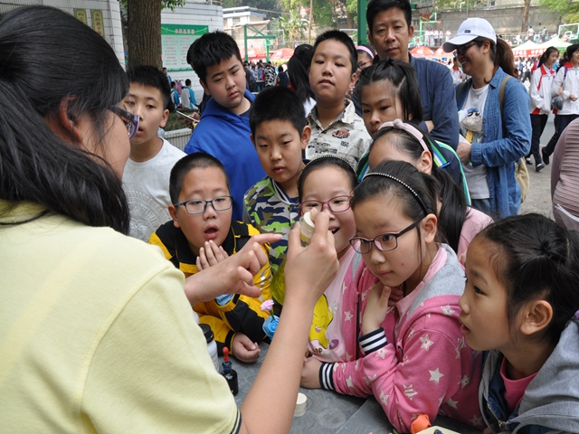 功夫不负有心人,活动刚刚开始,化学展览区就聚集了大批学生及家长,大家都对这些只能在魔术表演里见到的“戏法儿”好奇不已。“为什么一团火点上不一样的液体不熄灭反而有不同的颜色”、“为什么食醋里下了小苏打会有那么多泡沫产生”……很多学生被各种奇异绚丽的现象所吸引,对其中所蕴含的科学原理有着好奇,团团围着志愿者们想了解其中的奥秘。志愿者们自然是有备而来,对同学们的疑难问题早有准备,并且耐心地讲解了其中的原理奥秘,引得学生和家长们的连连称道。