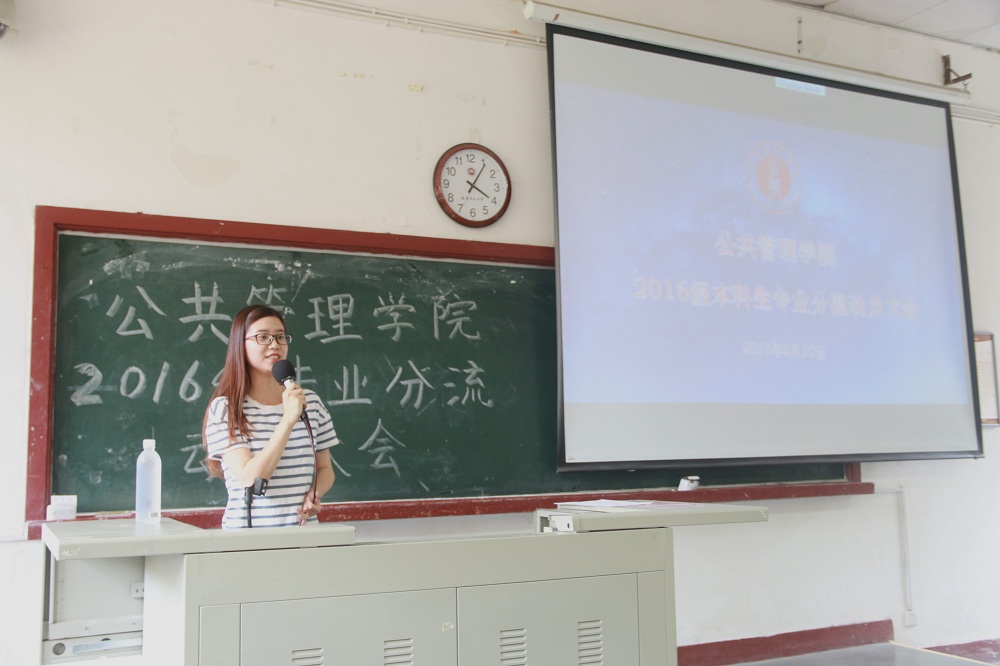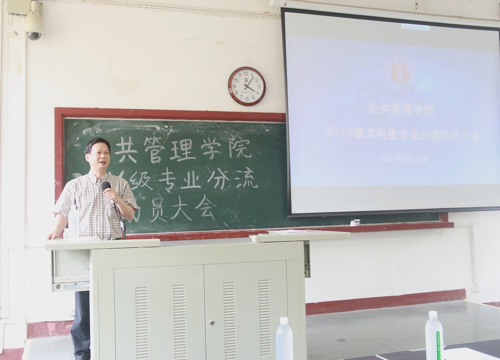 5月10日下午,公共管理学院于文科楼104教室举行了2016级本科生专业分流动员大会。院党委副书记徐挺汉、副院长吴立明,行政管理专业负责张铃枣,劳动与社会保障系主任谢宏忠,城市管理系负责人刘素芬出席,会议由2016级辅导员赵页主持。