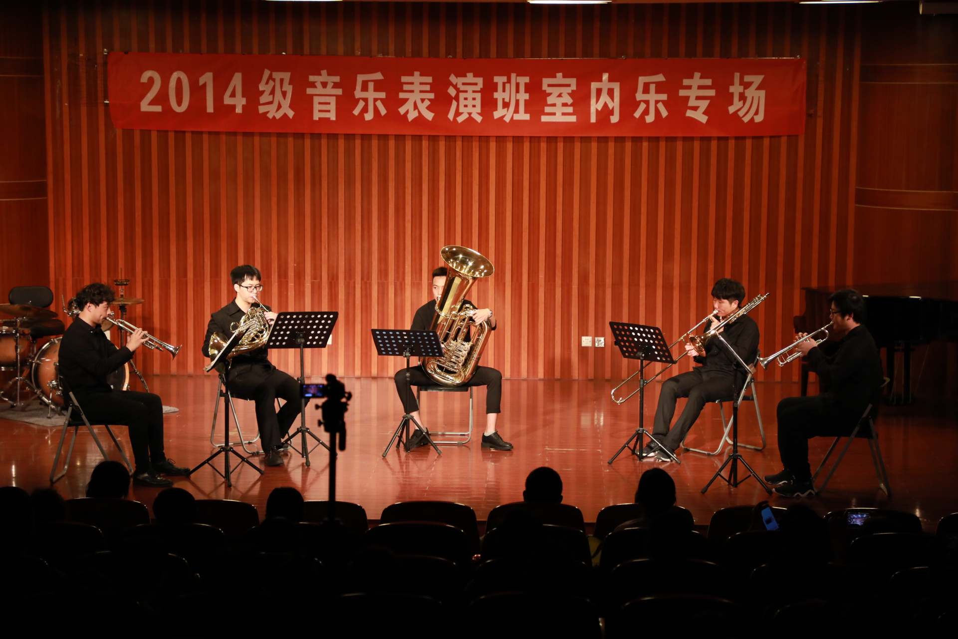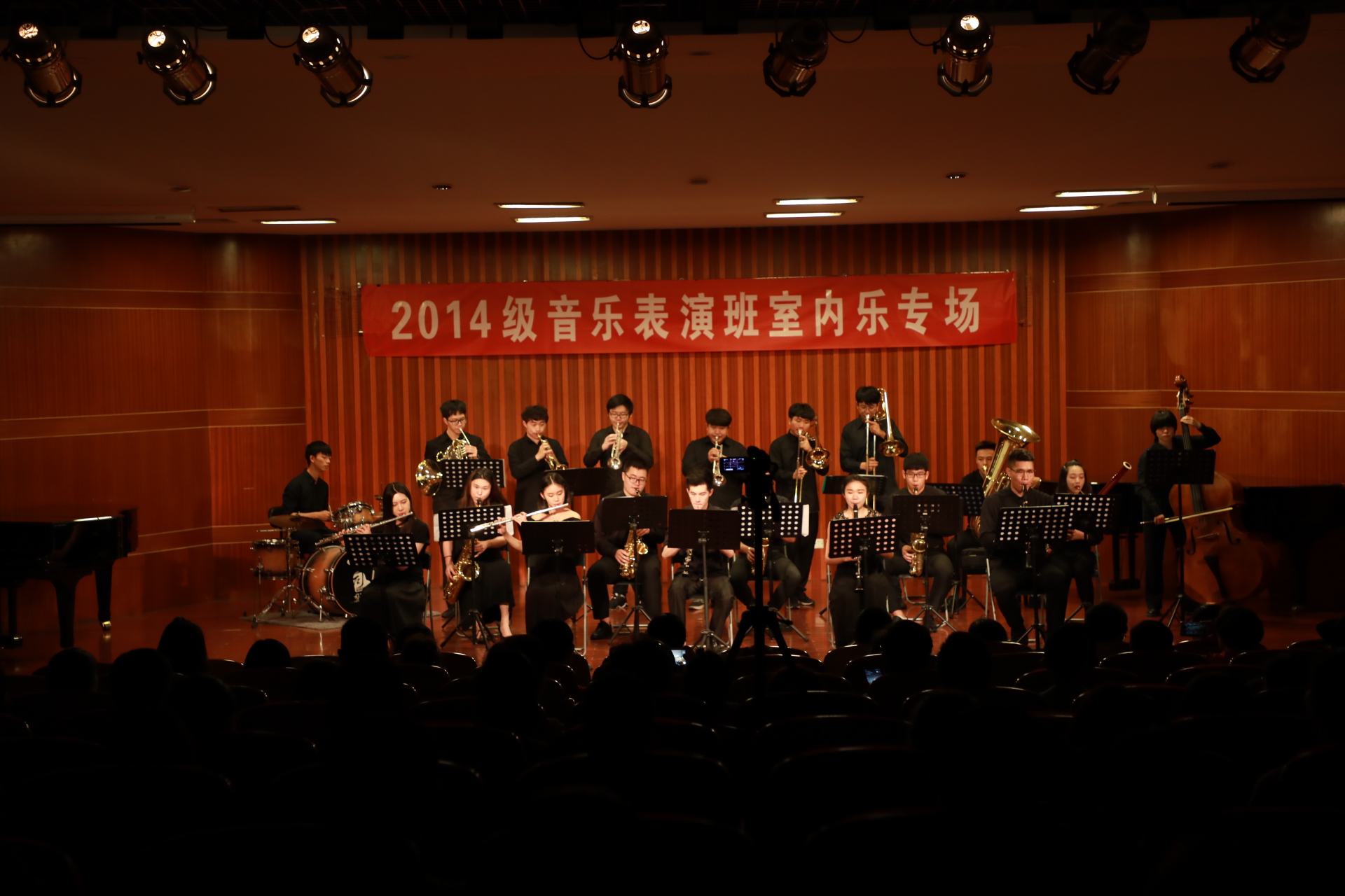 在主持人黄笛的宣布下,音乐会以一首经典的爵士乐《In The Mood》拉开序幕,轻快灵活的旋律瞬间抓住了现场观众的心,让人陶醉其中。铜管乐五重奏中,福音歌曲《奇异恩典》作为基督教的圣歌,其空灵、悠扬的旋律让人感受到上帝对人们的宽容和恩宠;而《杀手探戈》则令现场观众仿佛置身同名电影《杀手探戈》的观影现场,跟随者主角一起进入了那个丰富而神秘的田园般的世界。在下半场的演出中,古筝琵琶二重奏《春江花月夜》通过优美质朴的实情旋律描绘出夕阳西下,泛舟江上,游船箫鼓齐鸣的动人情景。而民乐合奏《云之南》所展现的浓郁的少数民族风味,更是赢得了观众们的热烈掌声。音乐会上弦乐四重奏、木管五重奏、民乐合奏、铜管五重奏等风格各异的节目精彩纷呈。作为最后压轴曲目的《拉弦乐小品三首》,邀请到了2014级辅导员施冰青作为嘉宾,给了大家一个意外的惊喜。最终,音乐会在观众的欢呼声中落下了圆满的帷幕。