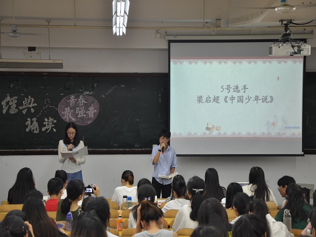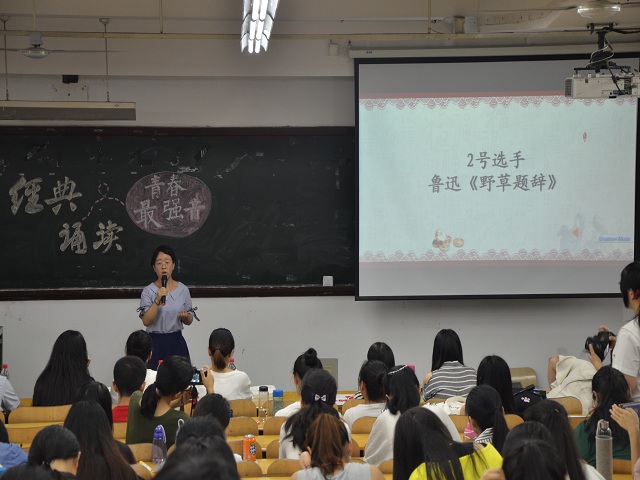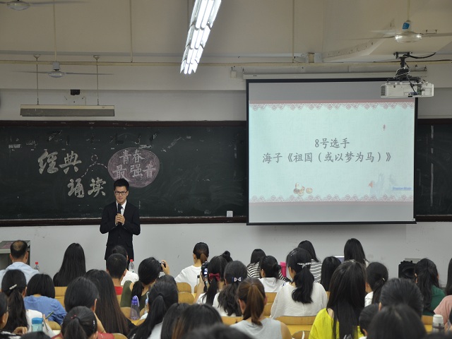 5月24日下午,由文学院2016级主办的“经典诵读·青春最强音”比赛在田家炳楼拉开帷幕。此次比赛由16级两委承办,全体同学到场聆听。受邀出席的嘉宾有2016级辅导员黄永茂老师,多位研究生学长学姐和院学生会主要领导干部。