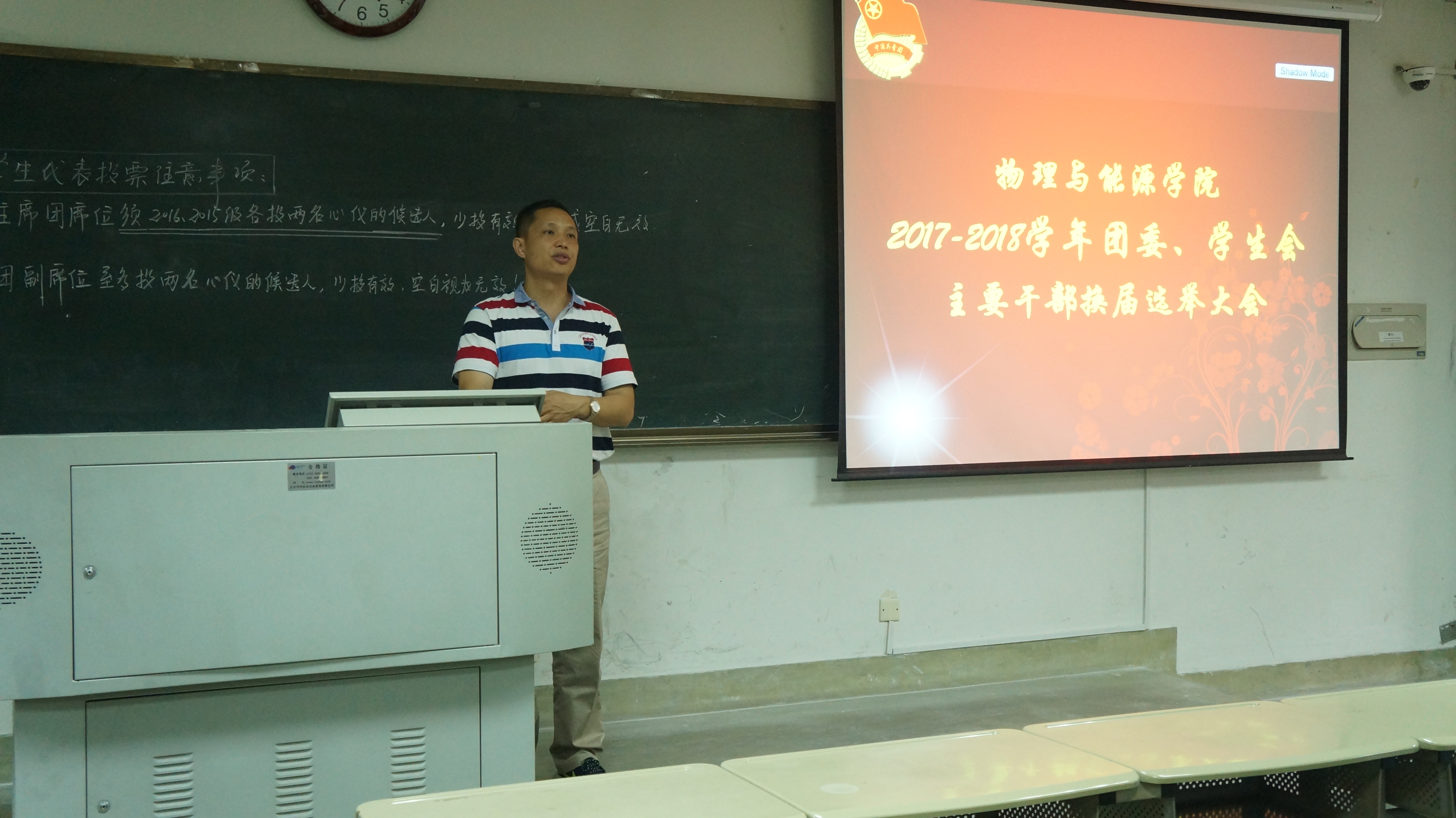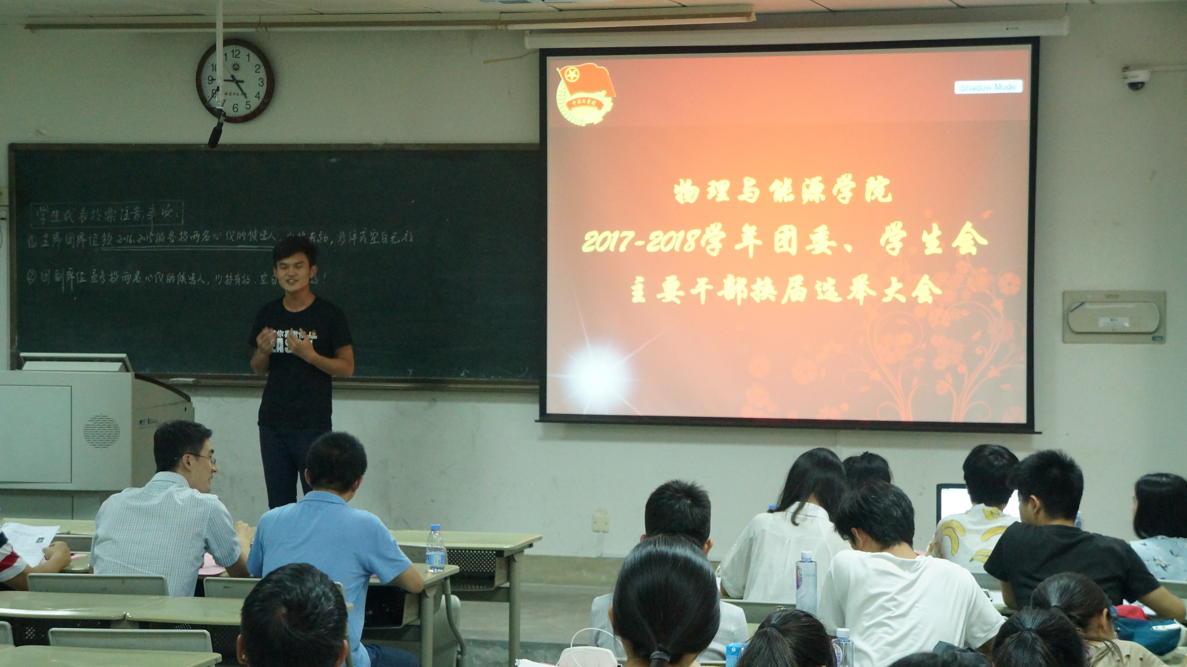5月31日下午,物理与能源学院2017-2018学年团委学生会主要干部竞选大会在笃行楼1-203教室举行。学院党委副书记钟庆林老师,学院团委书记、2015级辅导员林明惠老师,2014级辅导员蔡道锐老师,2016级辅导员何婷婷老师,学院部分学生干部,各年级学生干部及同学代表参加了大会。
