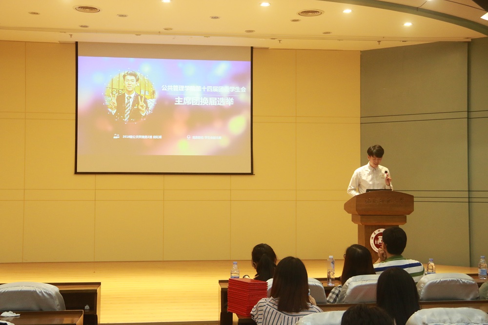 学生会主席黄移华首先总结了第十三届两委的工作成果,随后参加竞选同学依次上台自我介绍并阐述工作设想。竞选团委副书记一职的黄雷提出丰富人才培养机制的新设想,同时提出团副工作要重点促进“公管一家亲”氛围的形成;竞选主席一职的李思涵同学则提出岗位轮换制、匿名监督制等工作新思路。在副主席职位的竞选中,林惠卿、蒋妤婷、何钇甫、戴琪、吴垸柠、杨海飞诸位同学分别就社团人才机制建设、提高工作的双向沟通、加强工作的积极主动性以及构建完善的权责体系畅所欲言。最后,经过汇报展示和现场提问的综合评选,黄雷同学当选新团委副书记,李思涵当选新团委学生会主席,林惠卿、何钇甫和戴琪当选新团委副主席。