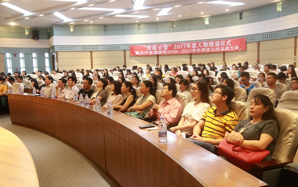 6月4日早,公共管理学院“情暖公管”2017年度人物颁奖仪式暨2016-2017学年团学工作总结大会于邵逸夫楼学术报告厅内顺利举行。院党委书记陈文、党委副书记徐挺汉、团委书记蔡艺颖,教职员和学生代表260余人出席本次大会。